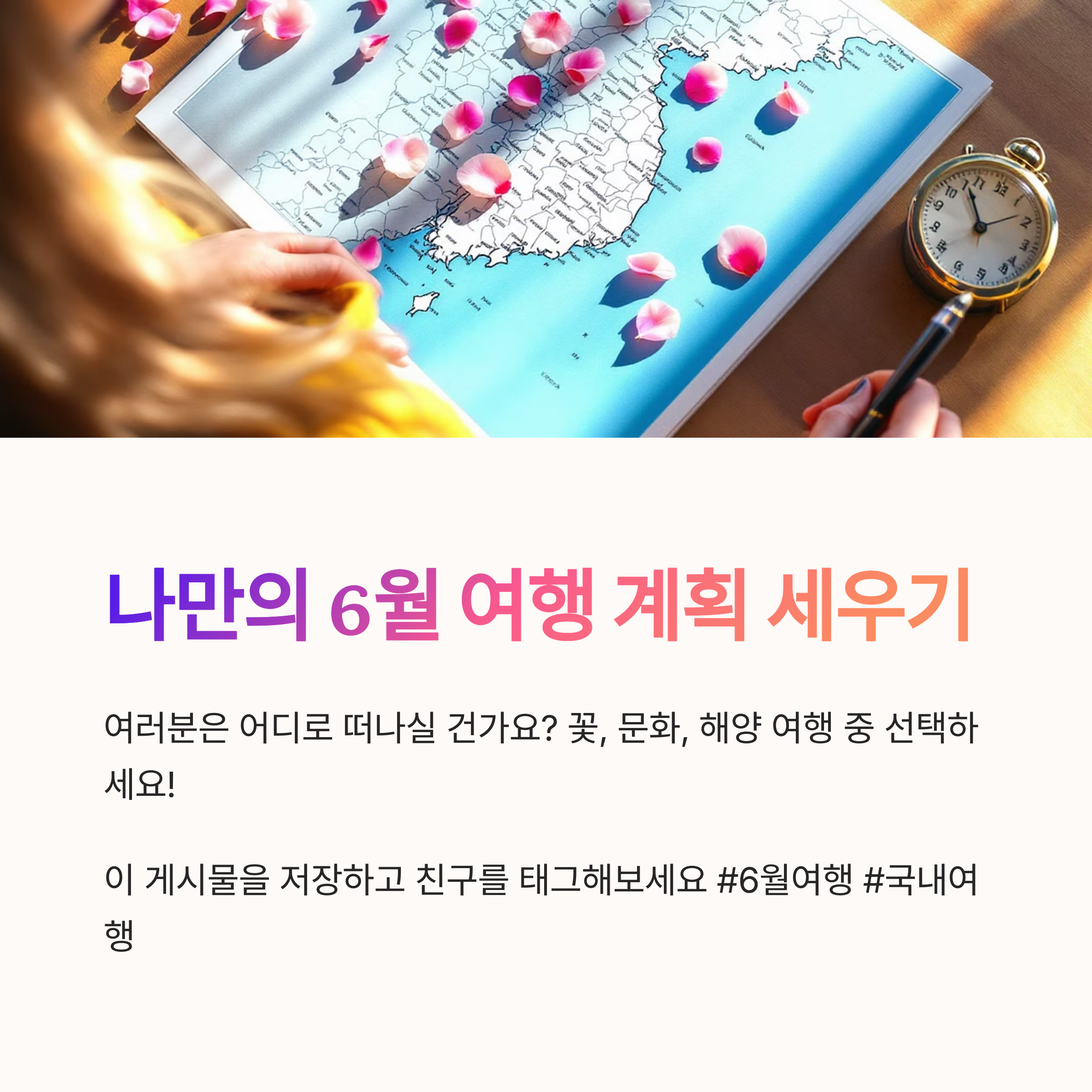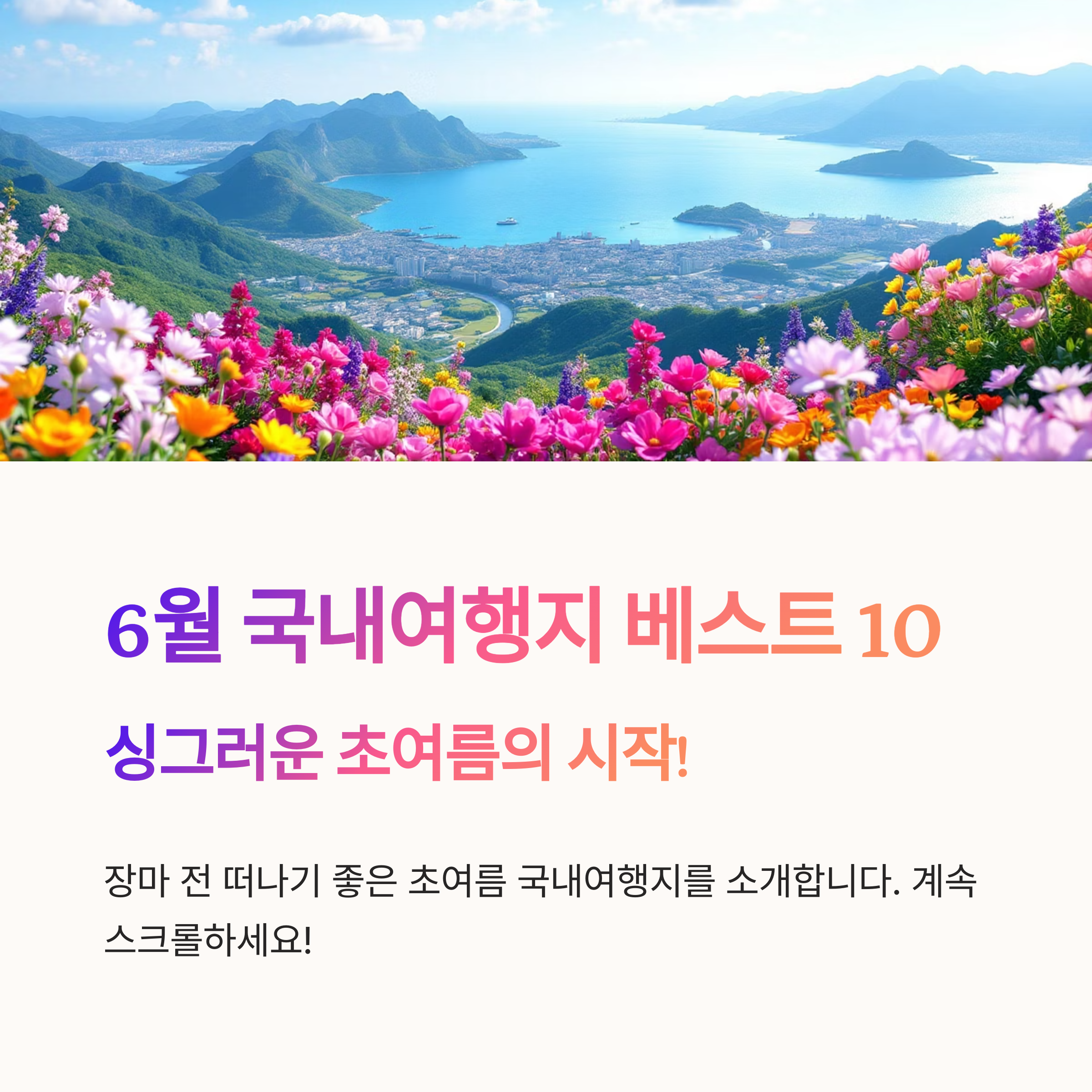 지금까지 초여름의 낭만을 가득 느낄 수 있는 6월 국내여행지 베스트 10을 소개해 드렸습니다. 푸른 녹음과 아름다운 꽃이 가득한 6월, 어디로 떠나든 분명 잊지 못할 추억을 만들 수 있을 거예요. 이 글이 여러분의 행복한 6월 여행 계획에 작은 도움이 되기를 바랍니다. 망설이지 말고 지금 바로 떠나보세요! 🚗