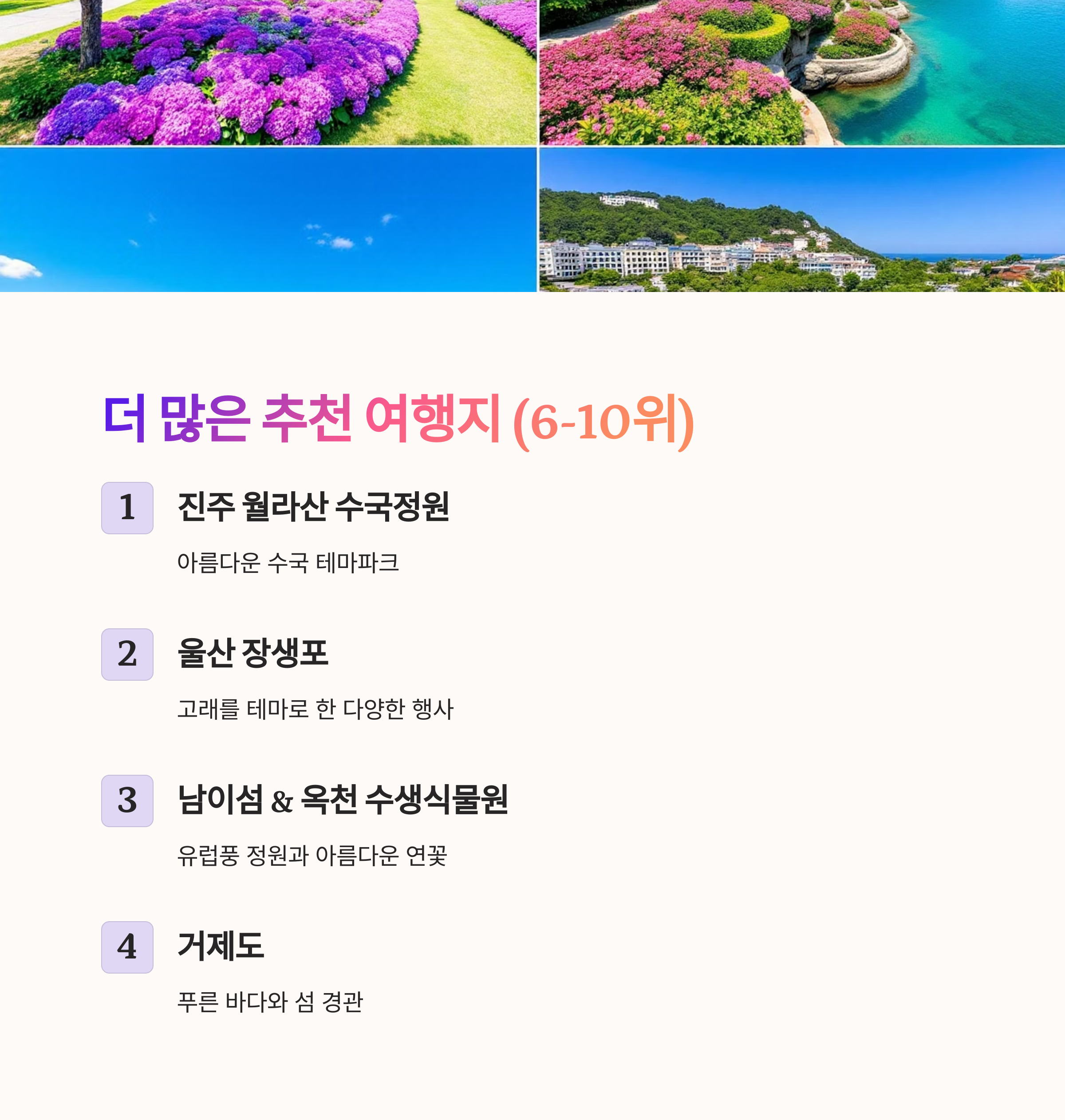 위에서 소개한 5곳 외에도 6월에 방문하기 좋은 곳들은 정말 많습니다. 🌊 바다와 수국을 함께 즐길 수 있는 부산 태종대, 더위를 식혀줄 푸른 대나무 숲이 우거진 전남 담양 죽녹원, 계단식 논과 바다가 어우러져 이국적인 풍경을 자아내는 경남 남해 다랭이마을, 아름다운 해변과 수목원이 있는 충남 태안, 수도권에서 가볍게 떠나기 좋은 경기도 파주의 수목원들도 훌륭한 6월 여행지입니다.