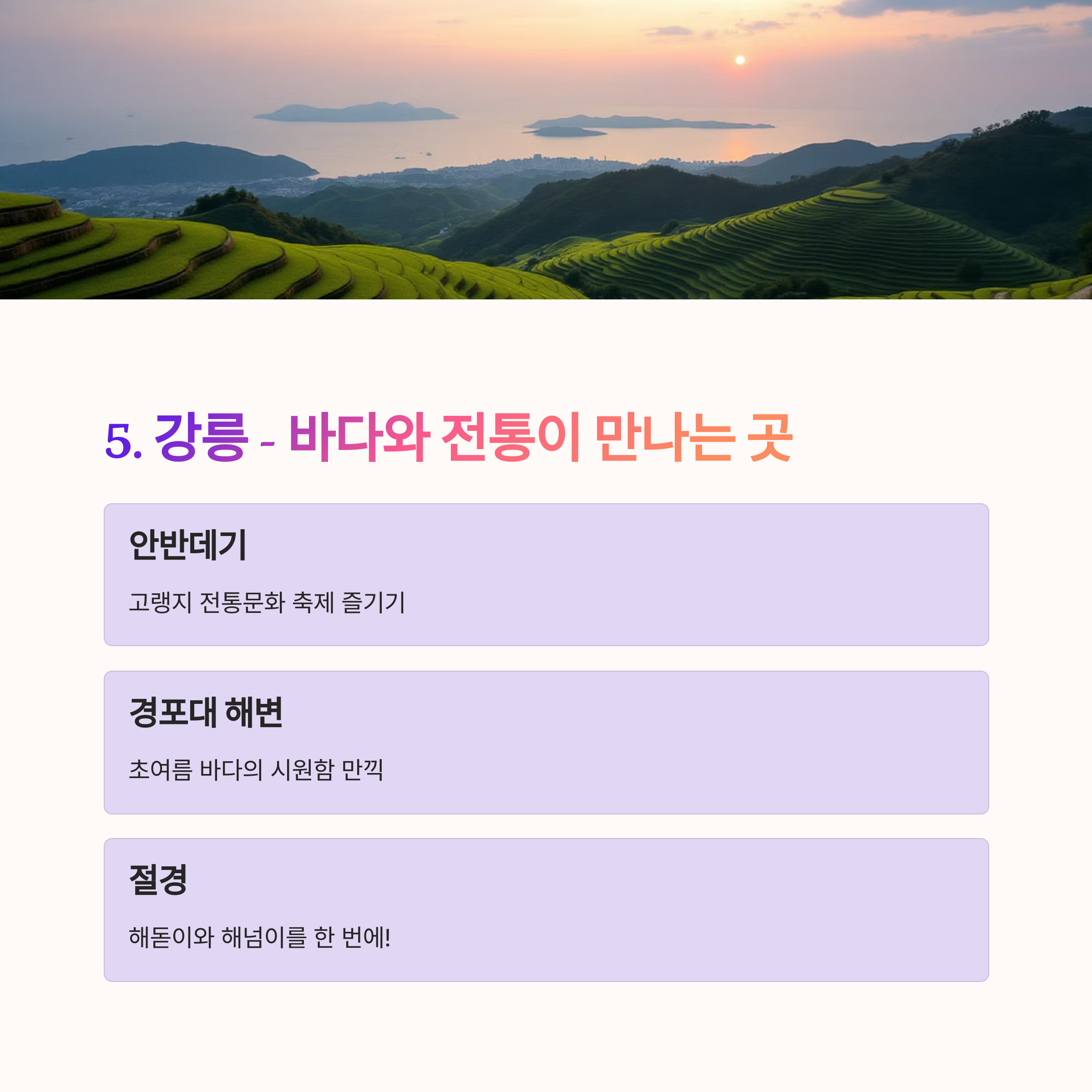 | 강원도 강릉 | 경포해변, 안목해변 | 한적한 바다, 강릉단오제 |