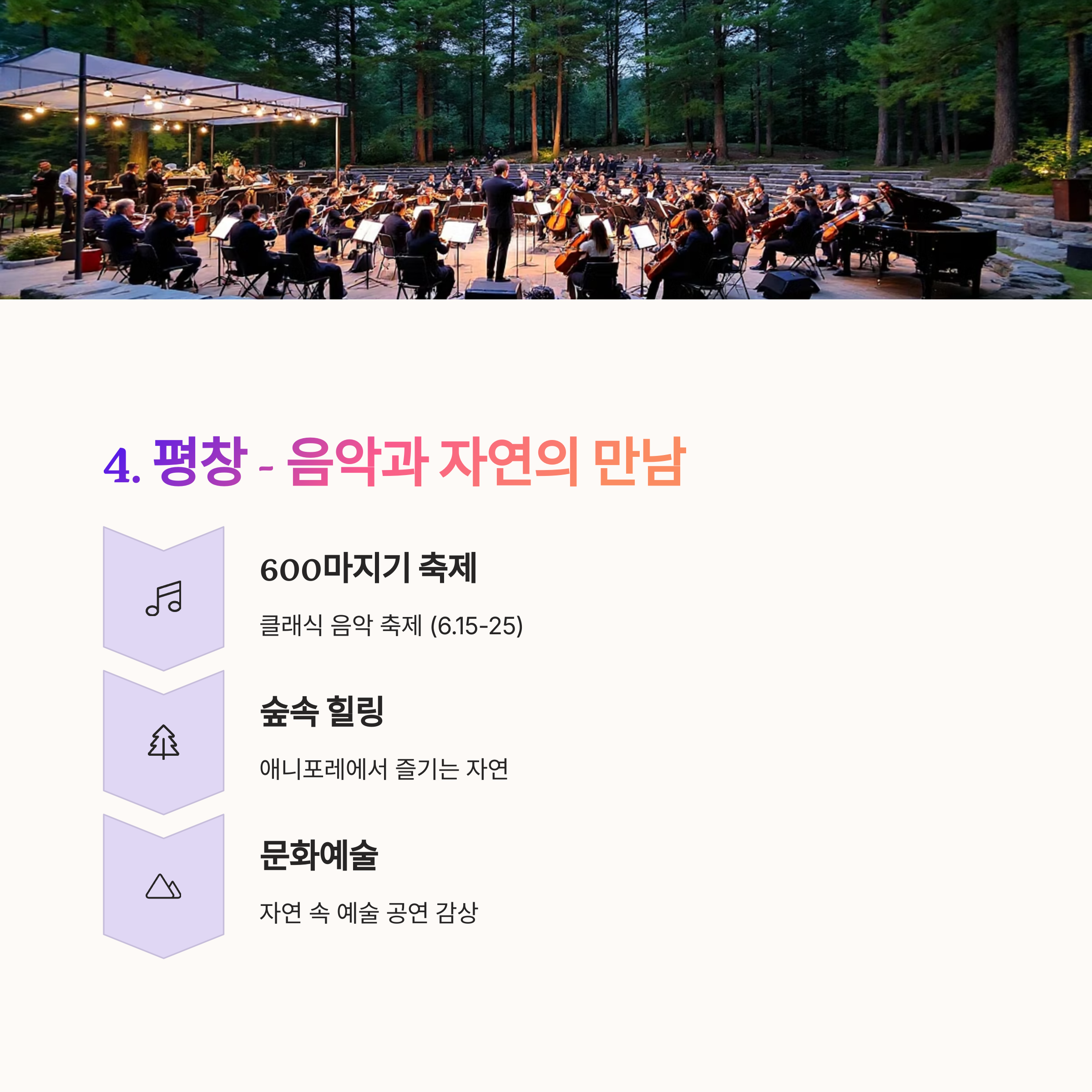 거대한 풍력발전기와 어우러진 이국적인 모습은 이곳의 매력을 더합니다. 시원한 바람을 맞으며 일상에서 벗어나 진정한 힐링을 경험하고 싶다면, 평창은 최고의 6월 국내여행지가 될 것입니다.