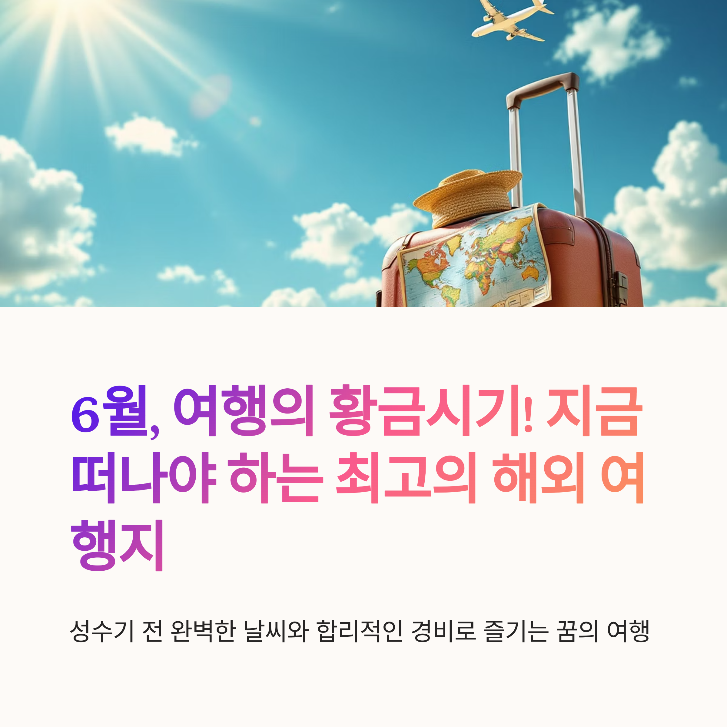 본격적인 여름휴가 시즌의 북적임을 피해, 가장 완벽한 날씨 속에서 여행의 여유를 만끽할 수 있는 달이 바로 6월입니다. 항공권이나 숙소 가격도 7~8월 성수기에 비해 비교적 합리적이라, 저 같은 여행 고수(?)들은 일부러 6월을 공략하기도 하죠.