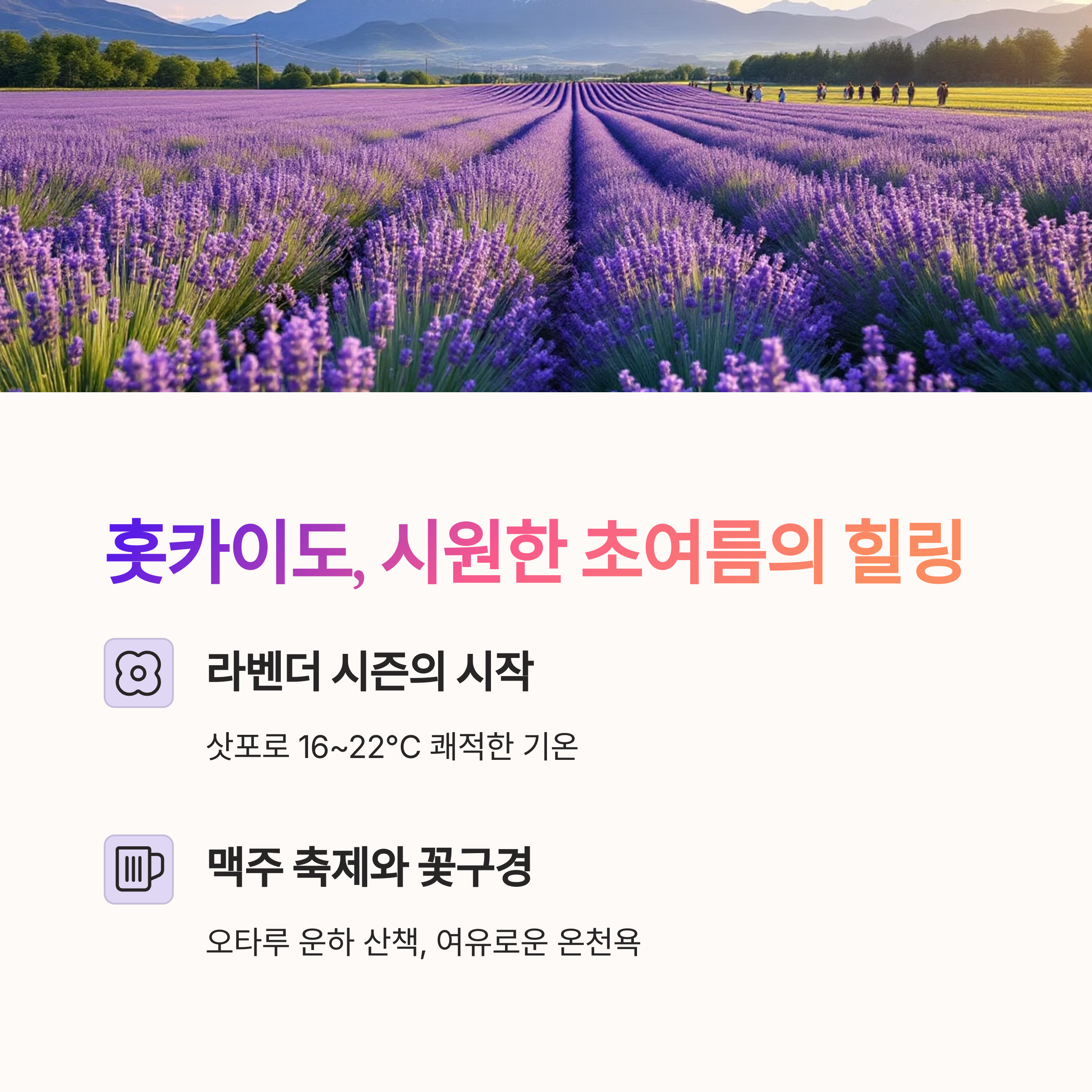 일본 본토가 장마로 꿉꿉한 6월, 홋카이도는 평균 기온 20도 내외의 쾌적하고 서늘한 날씨를 자랑합니다. 후라노와 비에이 지역은 형형색색의 꽃들이 언덕을 가득 메우고, 6월 말부터는 보랏빛 라벤더가 피기 시작하죠. 신선한 해산물과 유제품으로 만든 디저트를 맛보는 즐거움도 빼놓을 수 없습니다.