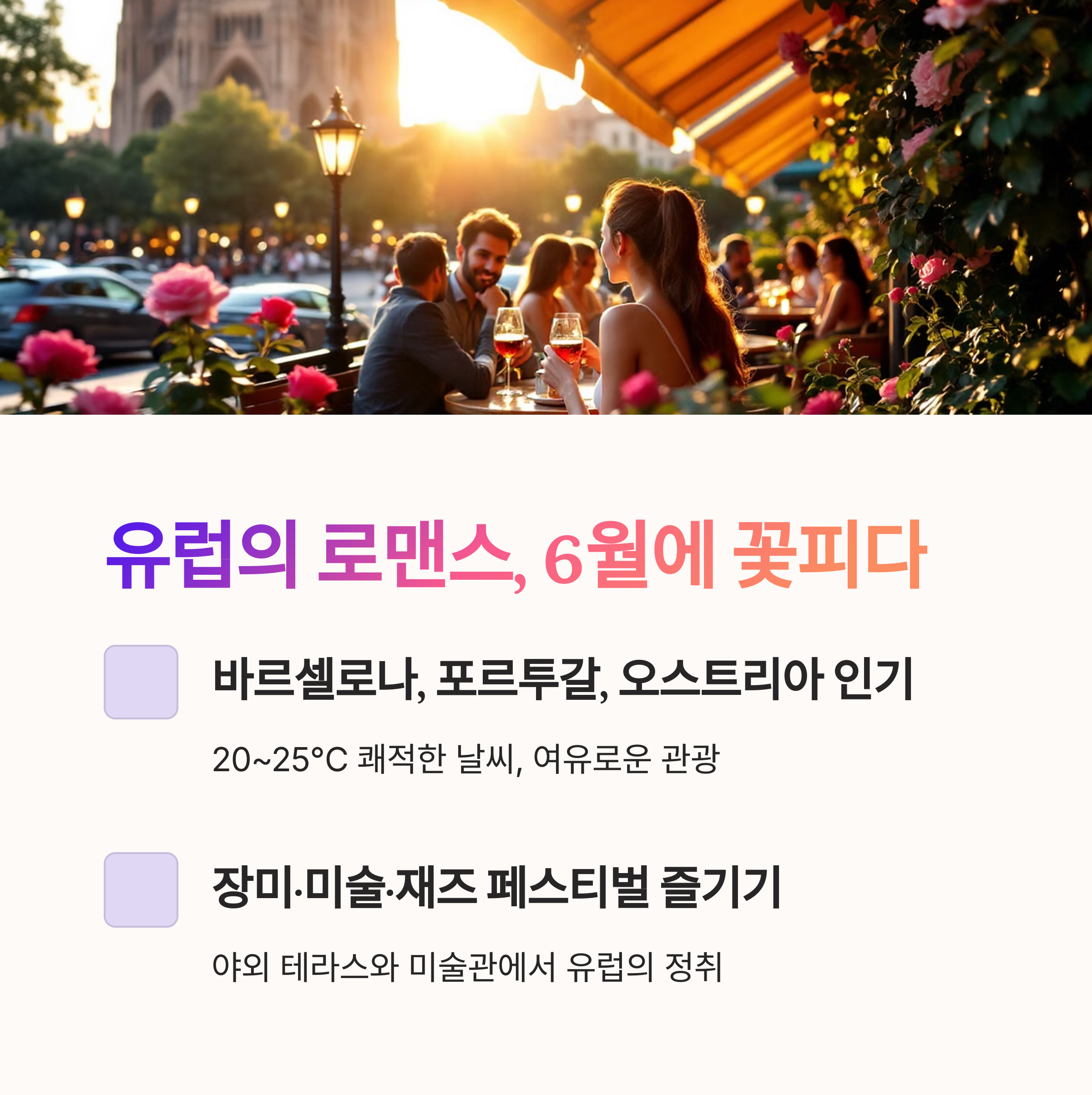 6월의 유럽은 그야말로 '축복'입니다. 살인적인 더위와 인파가 몰려오기 전, 가장 쾌적한 날씨 속에서 로맨틱한 도시와 자연을 즐길 수 있죠.