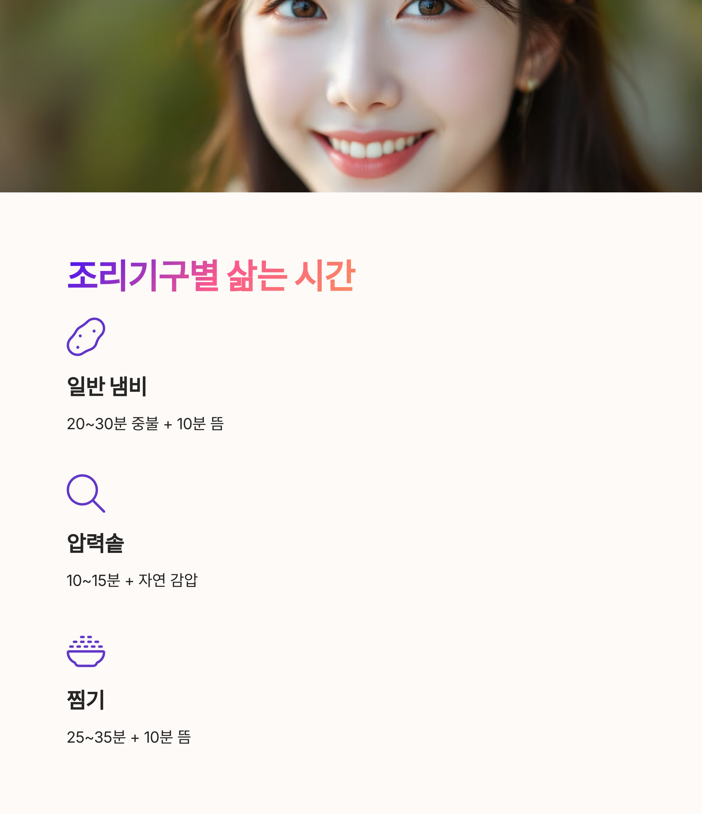 | 조리 기구 | 삶는 시간 (물이 끓기 시작한 후) | 뜸 들이기 | 비고 |