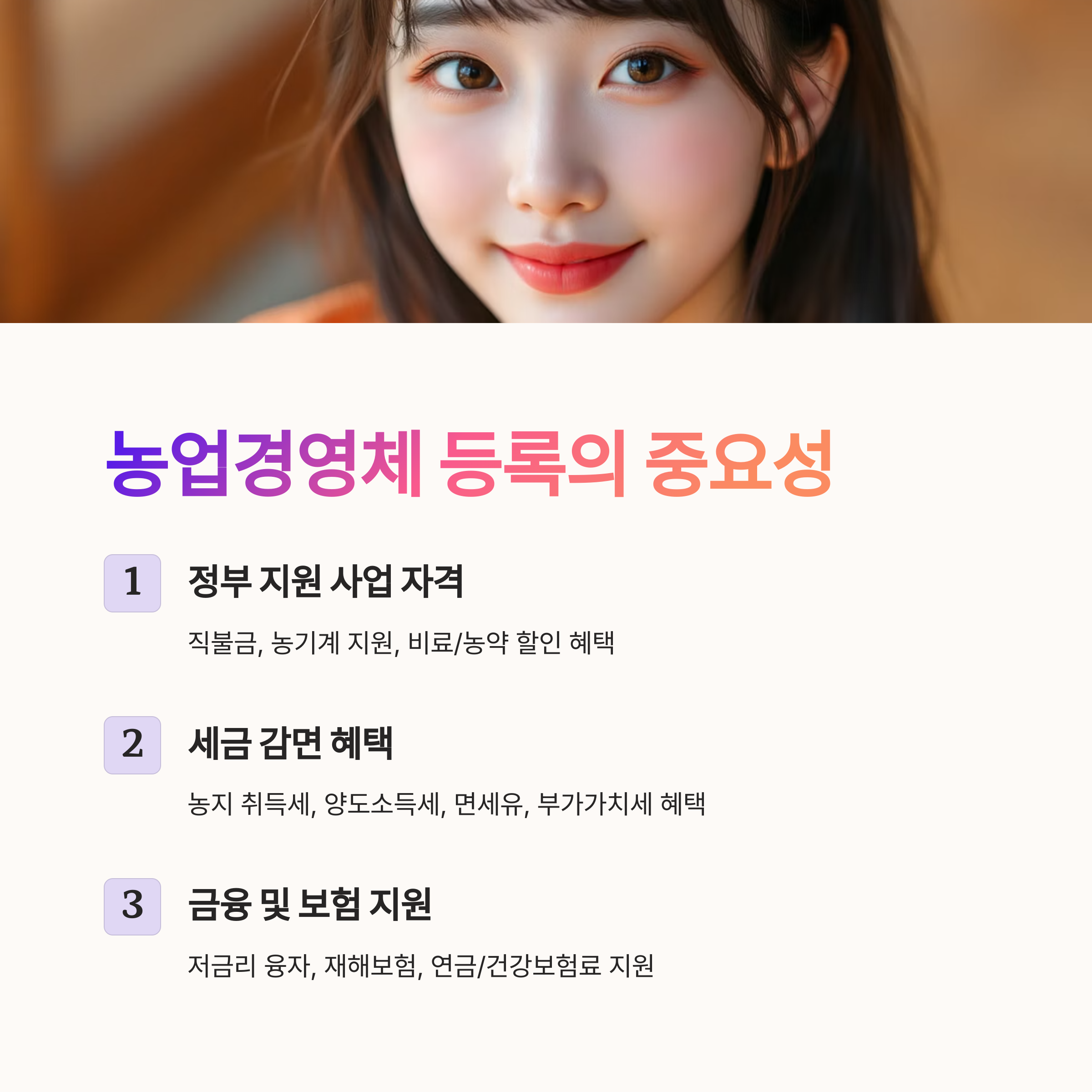 단순히 '내가 농업인이다'를 증명하는 것 이상의 의미가 있습니다. 농업경영체로 등록되어 있다는 것은 국가가 인정하는 공식 농업인이라는 뜻이며, 다양한 정책 지원의 대상이 됨을 의미합니다. 그 혜택, 정말 쏠쏠하답니다.