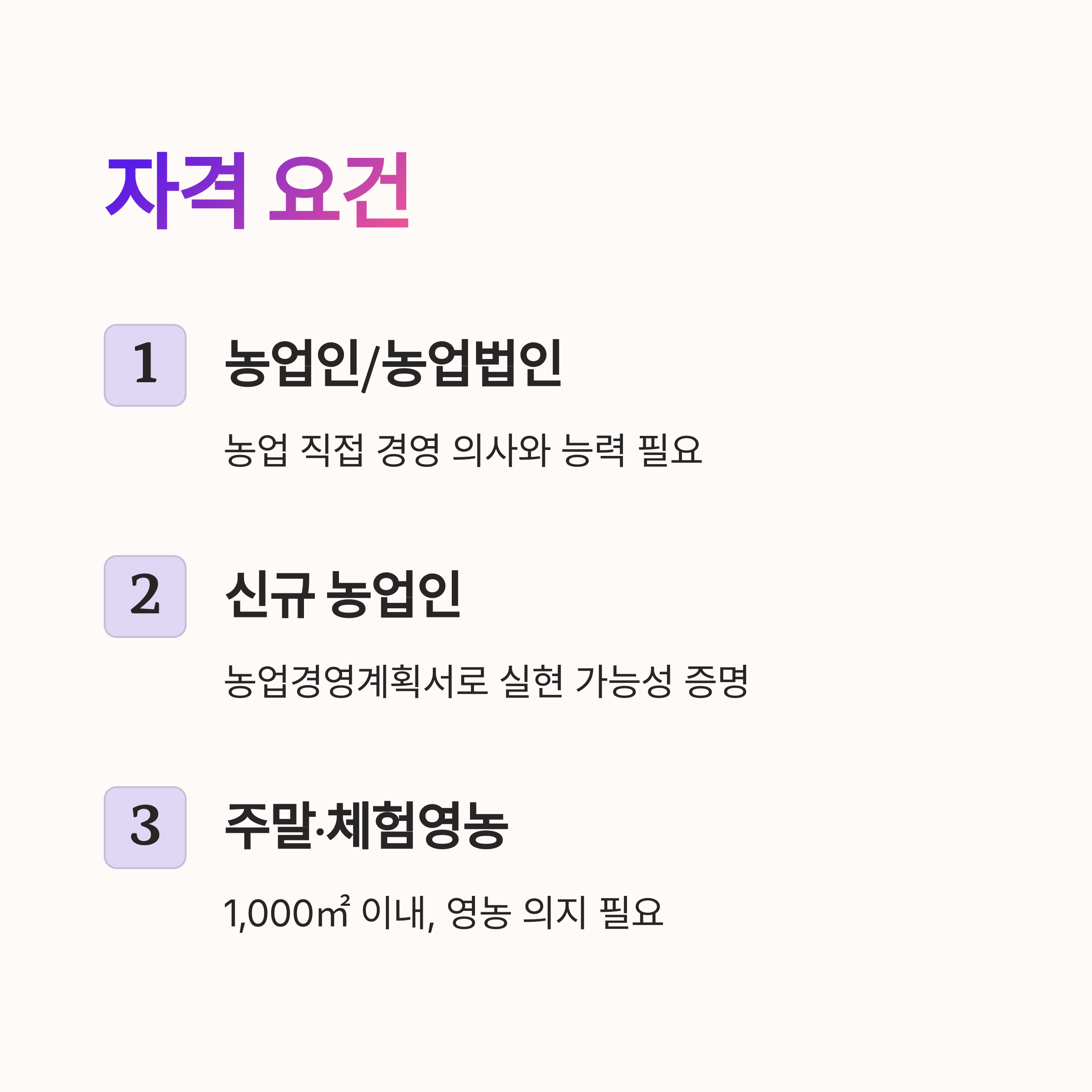 | 농업인 | 농업 경영 의사 및 능력 | 농업경영계획서, 농업인 확인서 |