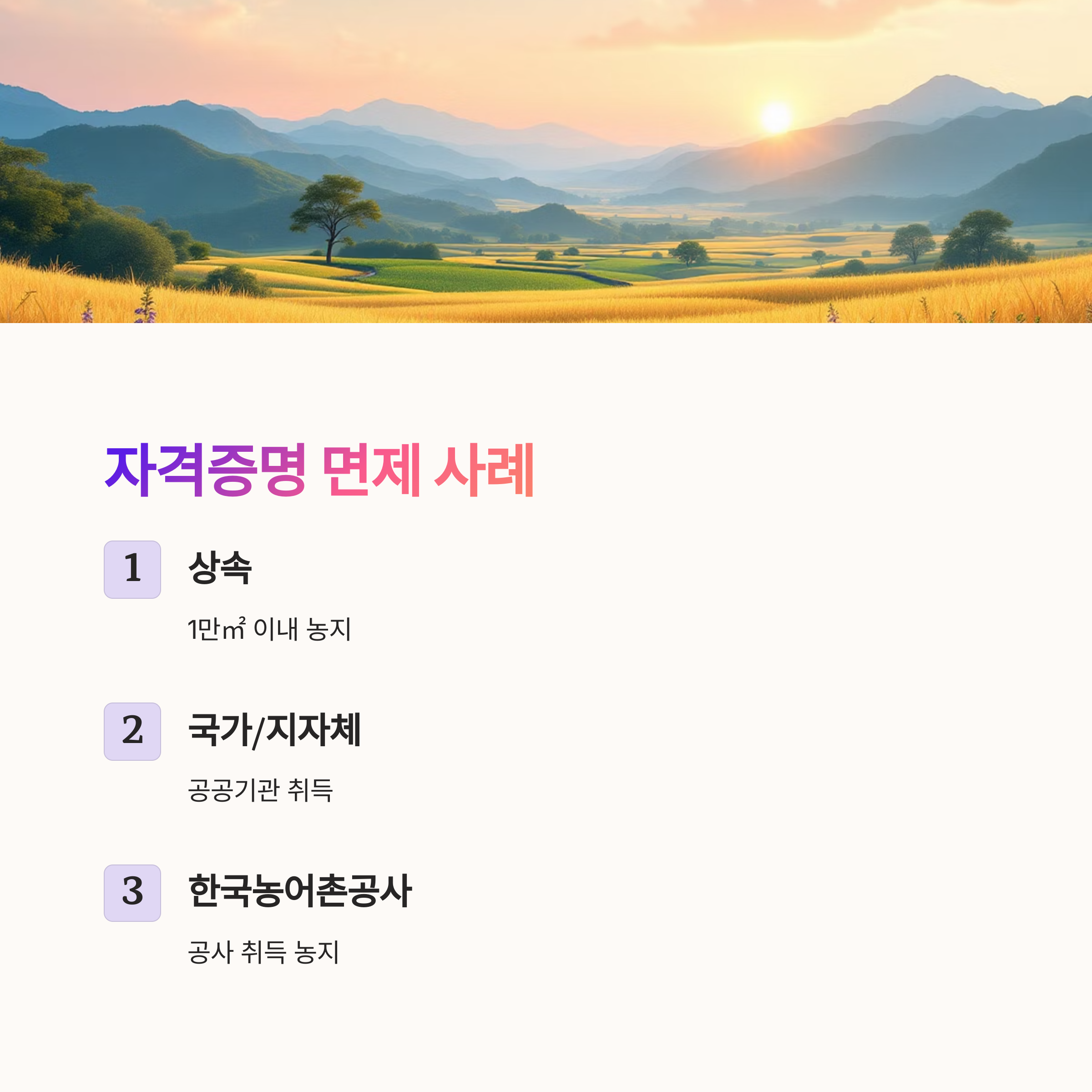 모든 농지 취득에 농지취득자격증명이 필요한 것은 아니에요. 다음의 경우에는 자격증명 없이도 농지를 취득할 수 있습니다.