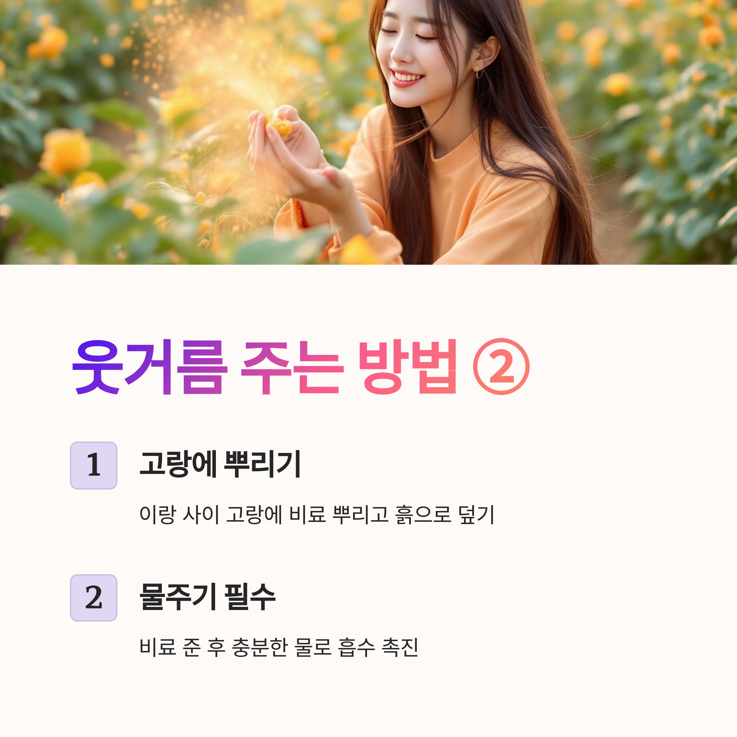 | 구분 | 웃거름 시기 | 주는 비료 (예시) | 핵심 포인트 |
