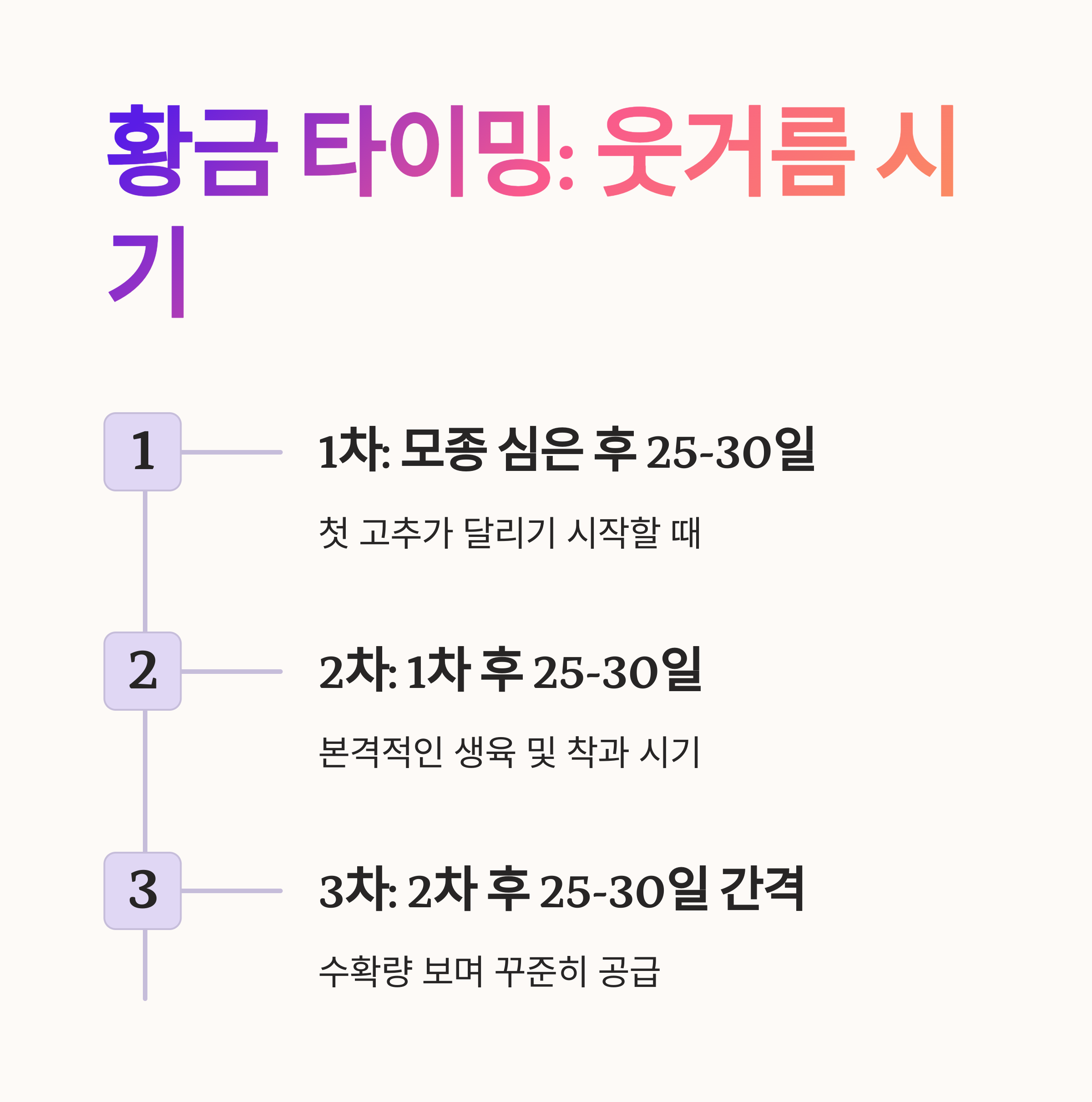 | 3차 웃거름 이후 | 2차 웃거름 후 25~30일 간격 | NK 복합비료, 칼슘제 등 | 고추의 자람세와 수확량을 보며 꾸준히 공급 |