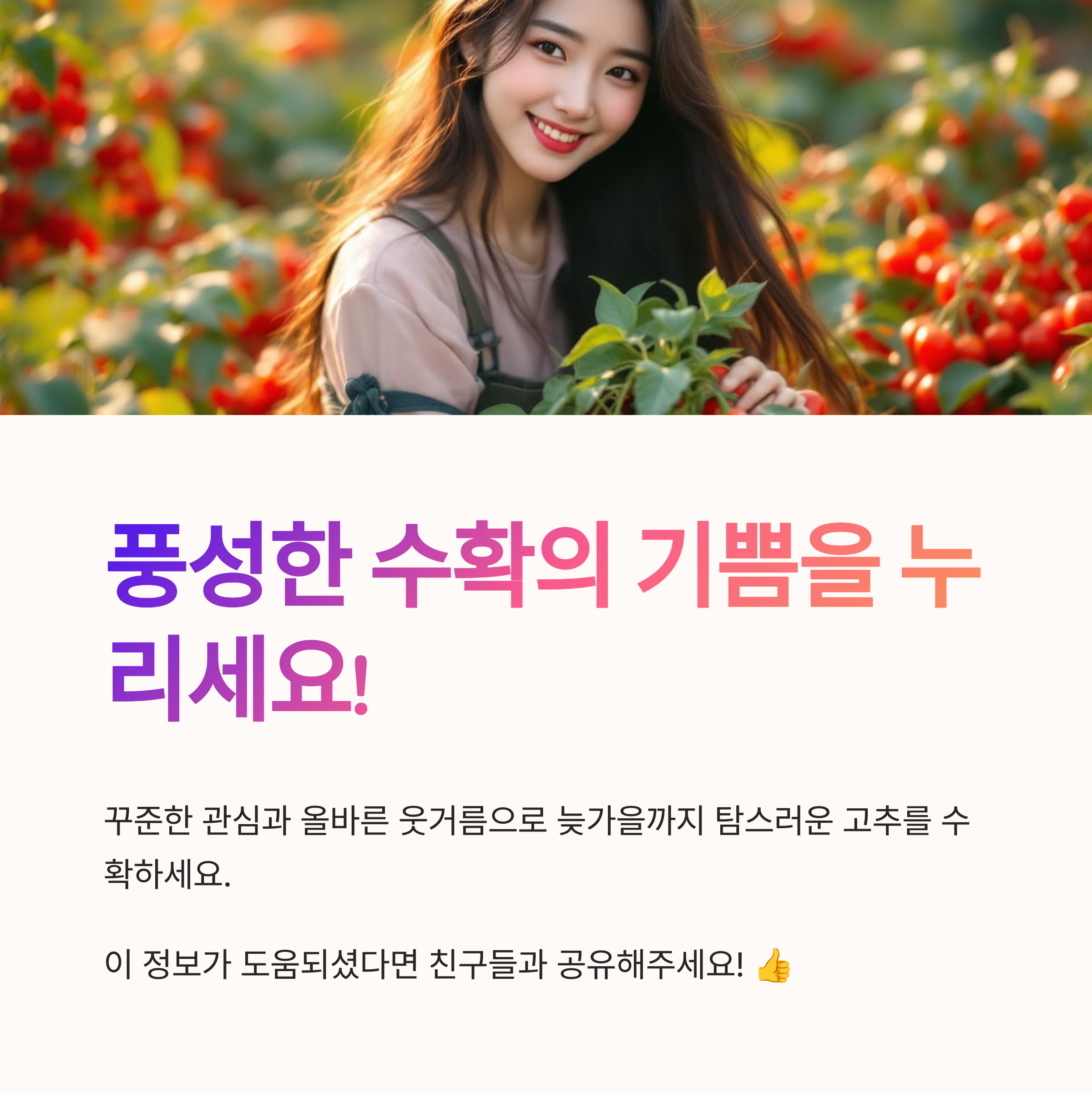 오늘 알려드린 고추 웃거름(비료)주는 시기와 고추 웃거름(비료)주는 방법을 잘 기억하셨다가 실천하신다면, 분명 늦가을까지 주렁주렁 열리는 탐스러운 고추를 보며 풍성한 수확의 기쁨을 맛보실 수 있을 겁니다. 여러분의 텃밭에 풍년이 가득하길 응원합니다! 💪