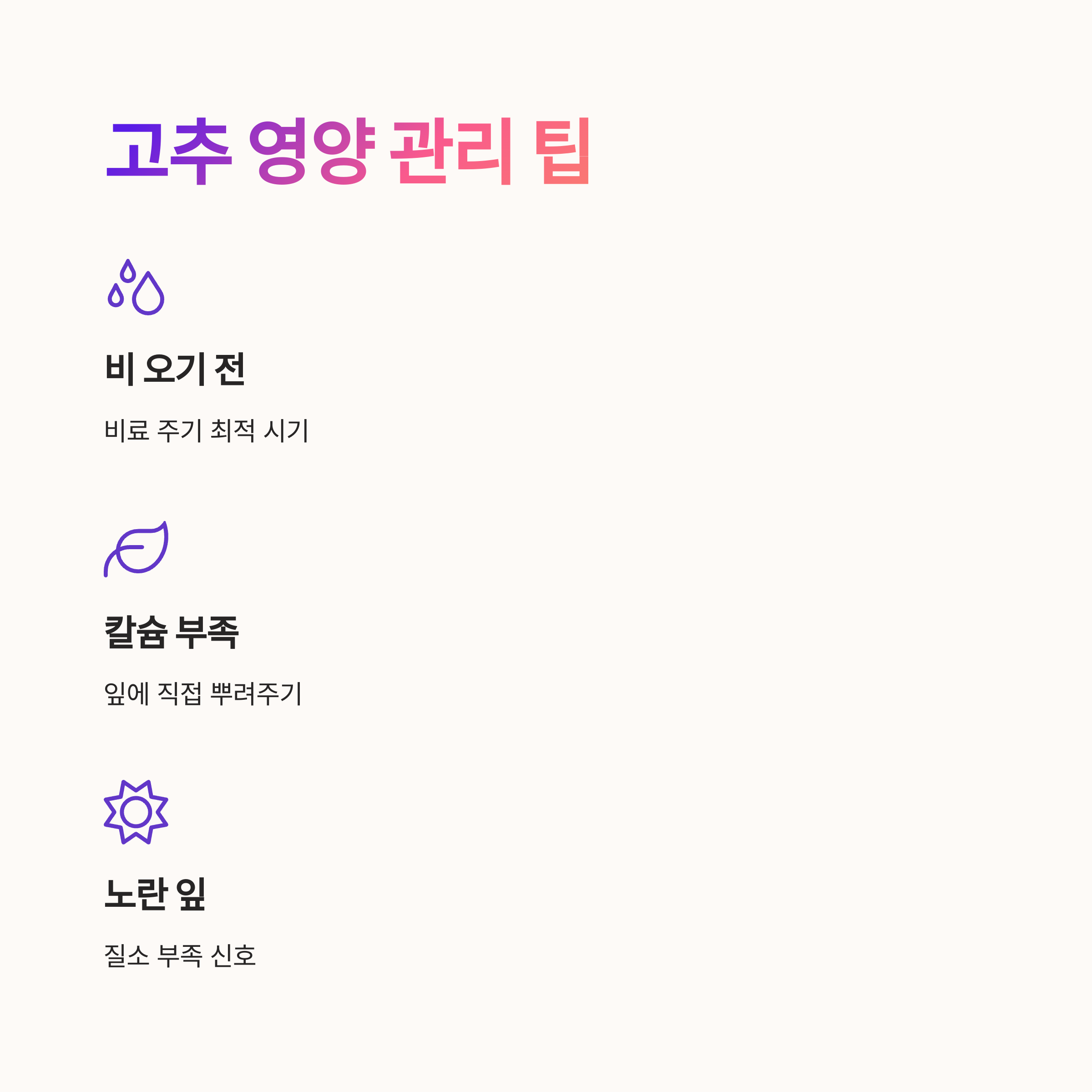 위 표는 일반적인 가이드라인입니다. 가장 중요한 것은 날짜를 세는 것보다 고추의 상태를 직접 관찰하는 것입니다. 1차 웃거름은 첫 번째 방아다리(Y자 가지)에서 고추가 열리기 시작할 무렵이 가장 좋은 타이밍입니다.