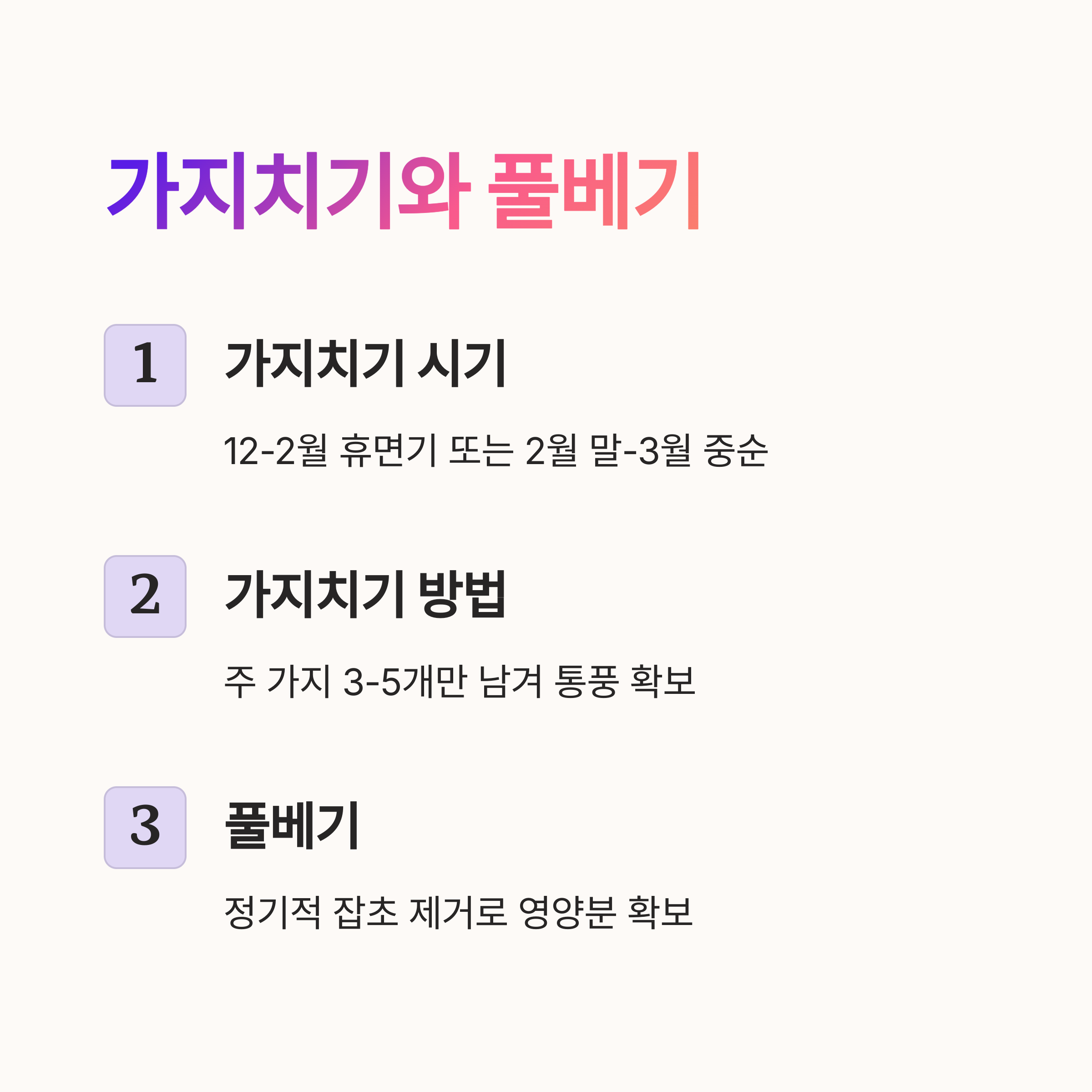 가지치기는 나무가 휴면기에 접어드는 12월~2월 사이, 또는 중부지방이라면 동해를 피하기 위해 2월 말~3월 중순에 하는 것이 좋아요. 불필요한 가지나 다른 가지를 방해하는 가지를 제거하고, 주 가지 3~5개를 남겨 통풍과 햇빛이 잘 들게 해주세요.