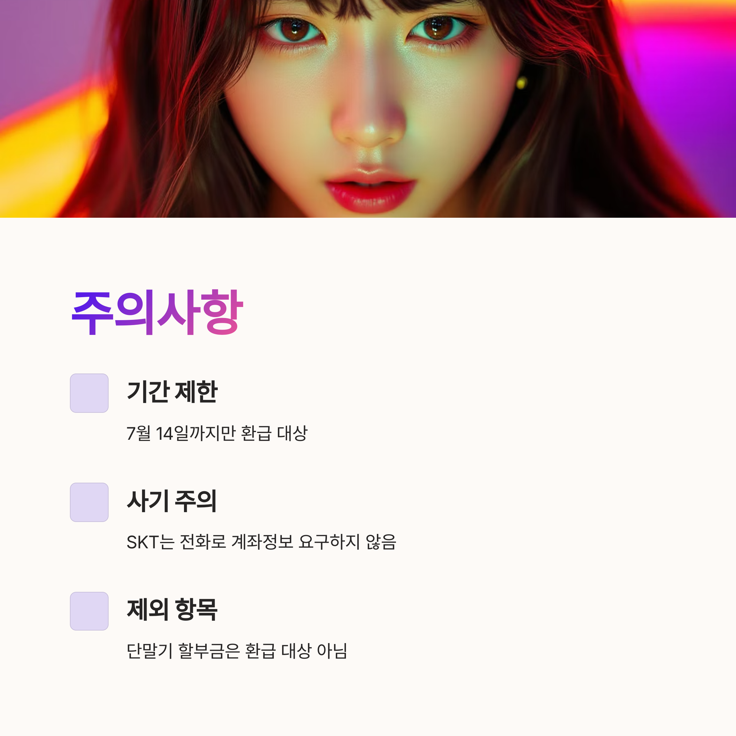SKT 위약금 환급조회 서비스를 이용할 때 몇 가지 주의할 점이 있어요. 첫째, 환급 대상 기간은 2025년 7월 14일까지로 제한됩니다. 이 기간을 놓치면 환급받기 어려우니 서둘러 확인하세요. 둘째, 사기 전화에 주의하세요. SKT는 절대 전화로 계좌번호나 비밀번호를 묻지 않습니다.