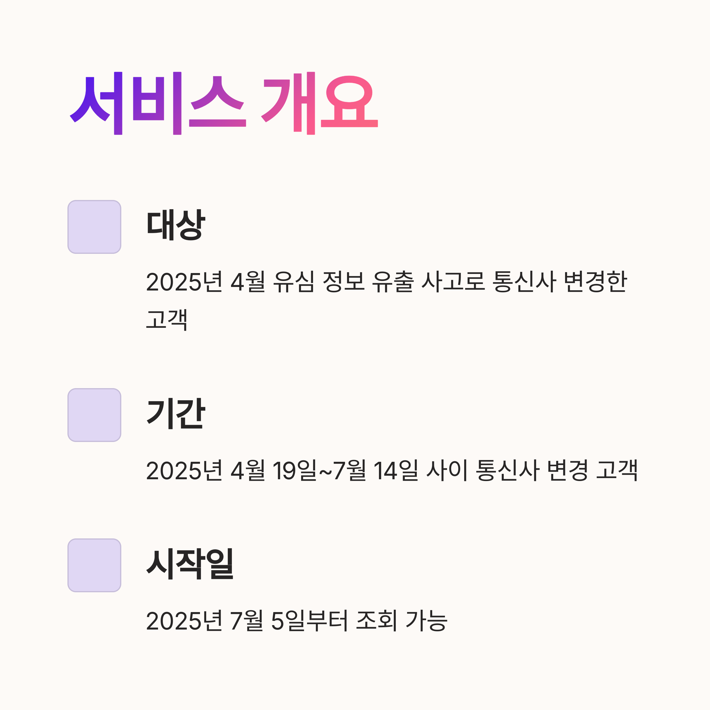 SKT 위약금 환급조회 서비스는 2025년 4월 유심 정보 유출 사고로 인해 통신사를 변경한 고객들이 위약금을 환급받을 수 있도록 돕는 서비스입니다. 정부와 과학기술정보통신부의 조사 결과, SKT의 보안 관리 소홀로 고객 피해가 발생했다는 판단에 따라 위약금 면제와 환급 정책이 시행됐어요.