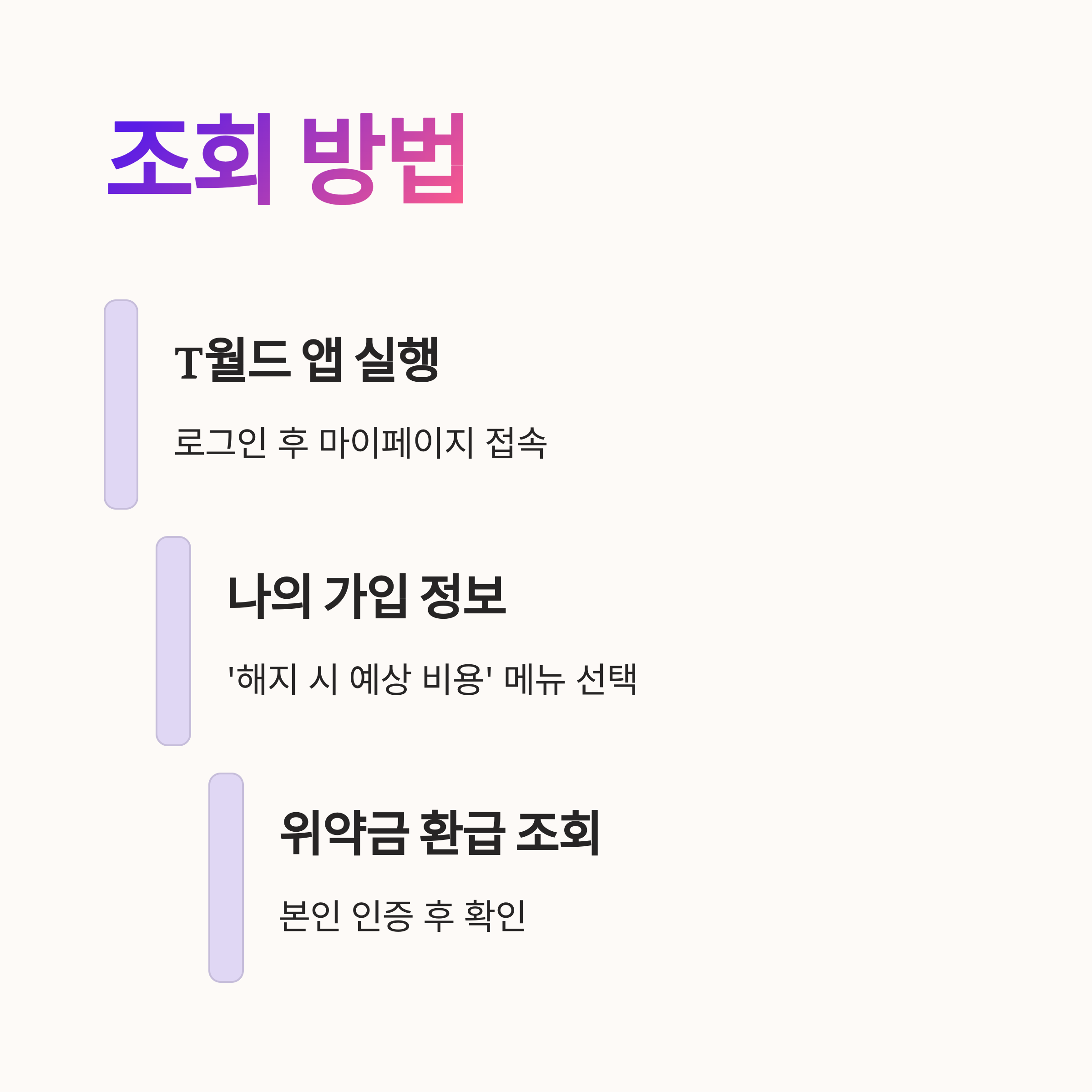 T월드 앱 또는 웹사이트의 ‘나의 가입 정보’에서 ‘위약금 환급 조회’ 메뉴를 통해 확인 가능하며, 고객센터(1599-0011)로도 문의할 수 있어요.