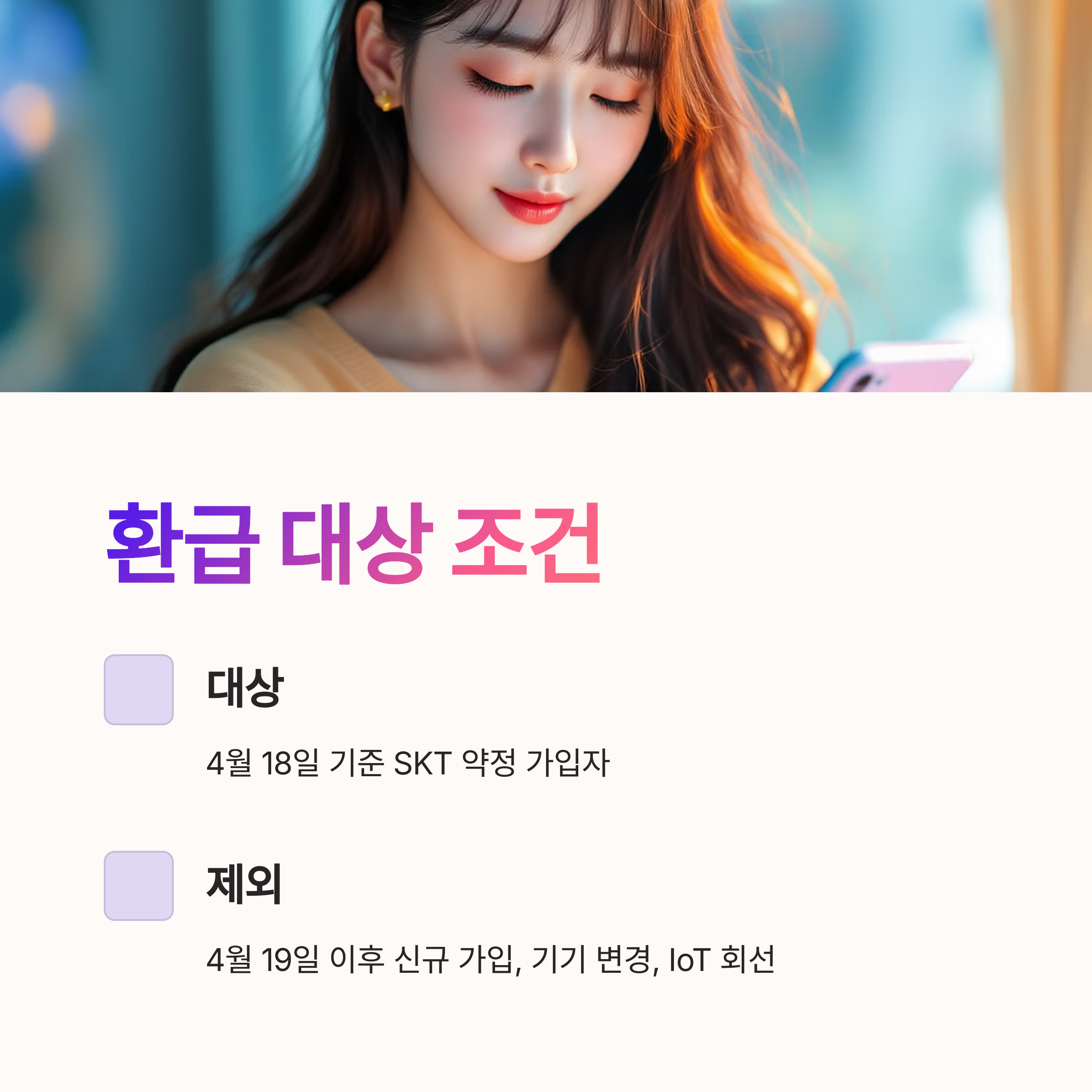 SKT 위약금 환급조회 서비스를 이용하려면 먼저 자신이 환급 대상인지 확인해야 해요. 모든 SKT 고객이 환급받을 수 있는 건 아니에요. 저도 처음엔 대상인지 몰라 걱정했지만, 조건을 꼼꼼히 확인한 후 안심했죠. 아래는 주요 조건입니다.