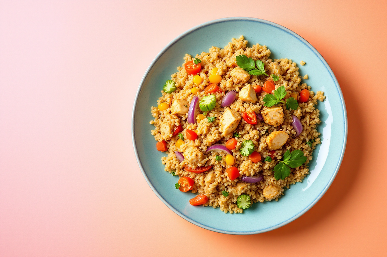 퀴노아는 2025년 슈퍼푸드 트렌드의 중심이에요. 단백질과 섬유질이 풍부해 아이들 성장에도 좋아요. 치킨과 채소를 더해 든든한 한 끼를 완성합니다.