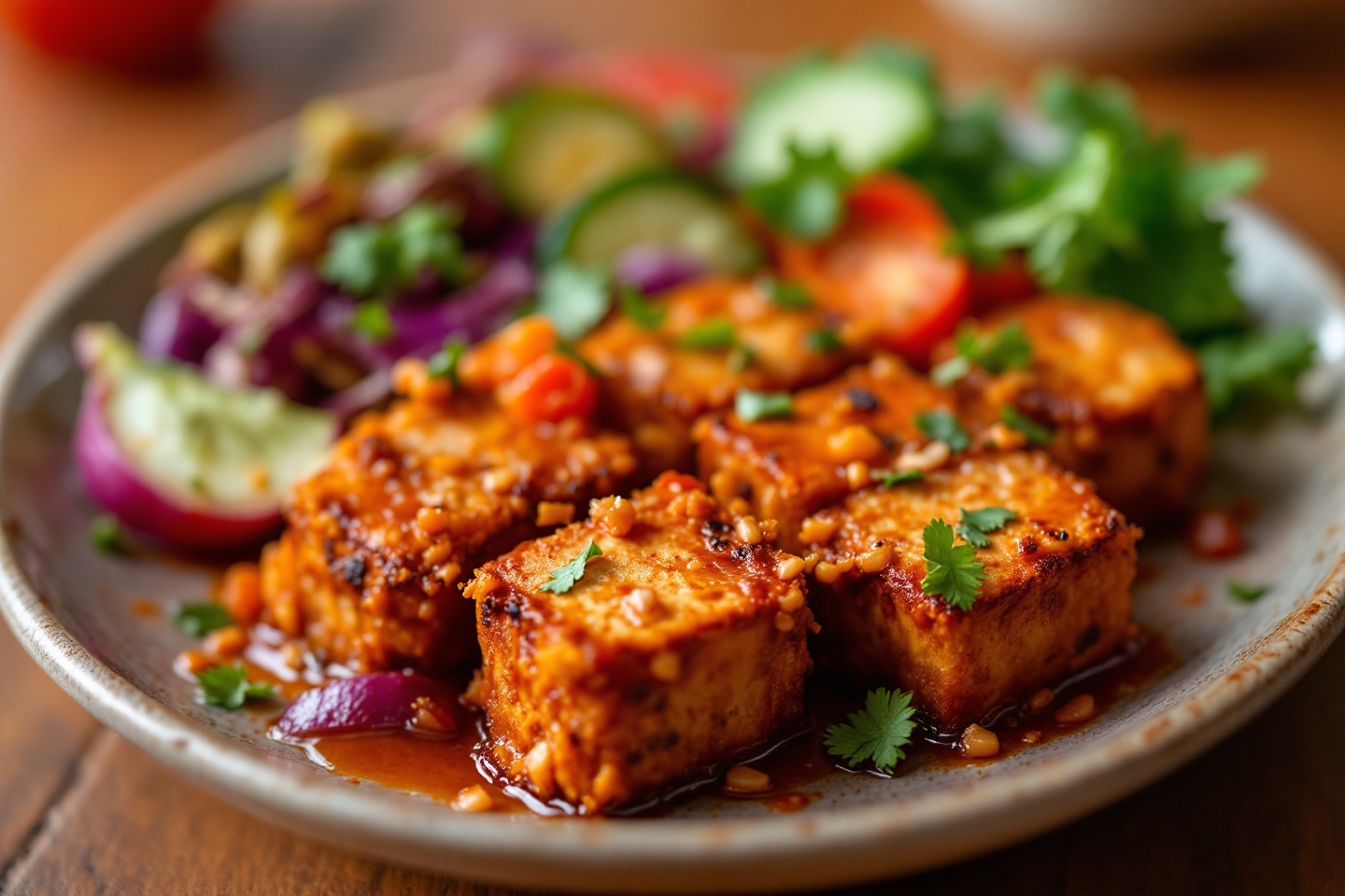 만드는 법: 두부를 1cm 두께로 썰어 소금, 후추로 밑간한 뒤 팬에 올리브 오일을 두르고 중불에서 5분씩 구워요. 애호박과 버섯도 함께 구운 뒤, 고추장과 간장을 섞은 소스를 발라 2분 더 구우면 완성! 조리 시간은 약 20분. 🥕