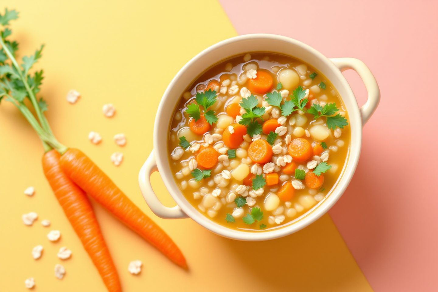 만드는 법: 귀리를 물에 10분 불린 뒤, 육수에 당근, 셀러리, 토마토소스를 넣고 15분 끓여요. 간은 소금으로 맞춥니다. 조리 시간은 약 25분.