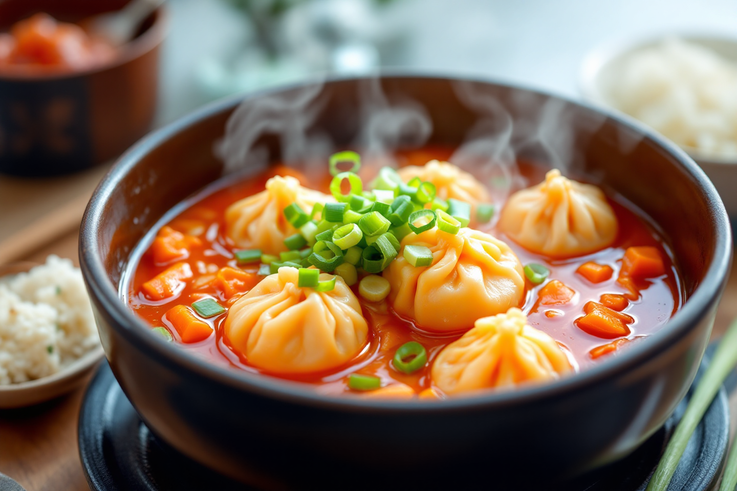 만드는 법: 냄비에 육수를 붓고 김치, 고추장, 간장을 넣어 끓입니다. 만두와 대파를 추가해 10분간 끓이면 완성! 조리 시간은 약 20분.