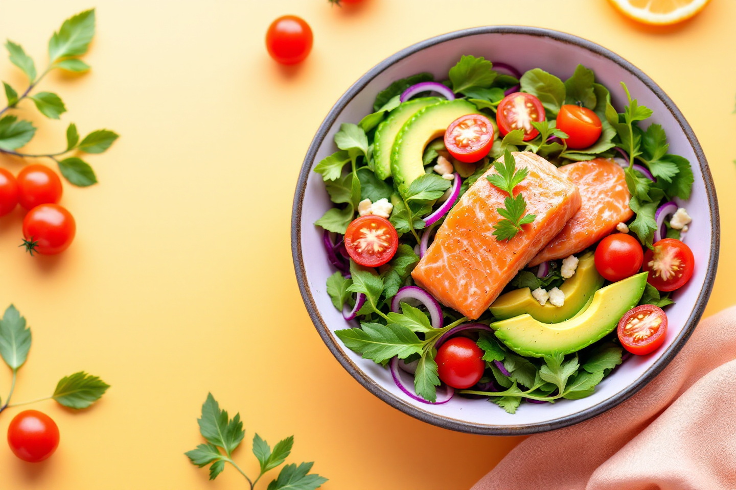 만드는 법: 양상추와 방울토마토를 먹기 좋게 썰어 볼에 담고, 아보카도와 연어를 슬라이스해 얹어요. 발사믹 드레싱을 뿌리면 끝! 조리 시간은 약 10분.