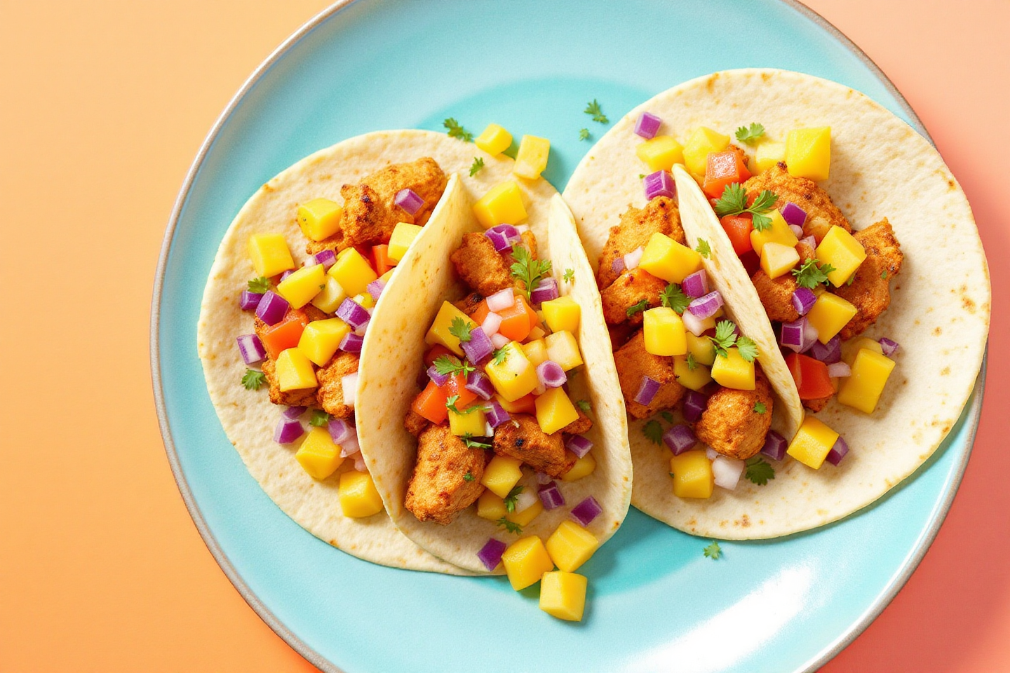 만드는 법: 닭가슴살을 구워 잘게 찢고, 망고와 양파를 다져 라임즙과 섞어 살사를 만듭니다. 타코 껍질에 닭고기와 살사를 얹으면 완성! 조리 시간은 약 20분.