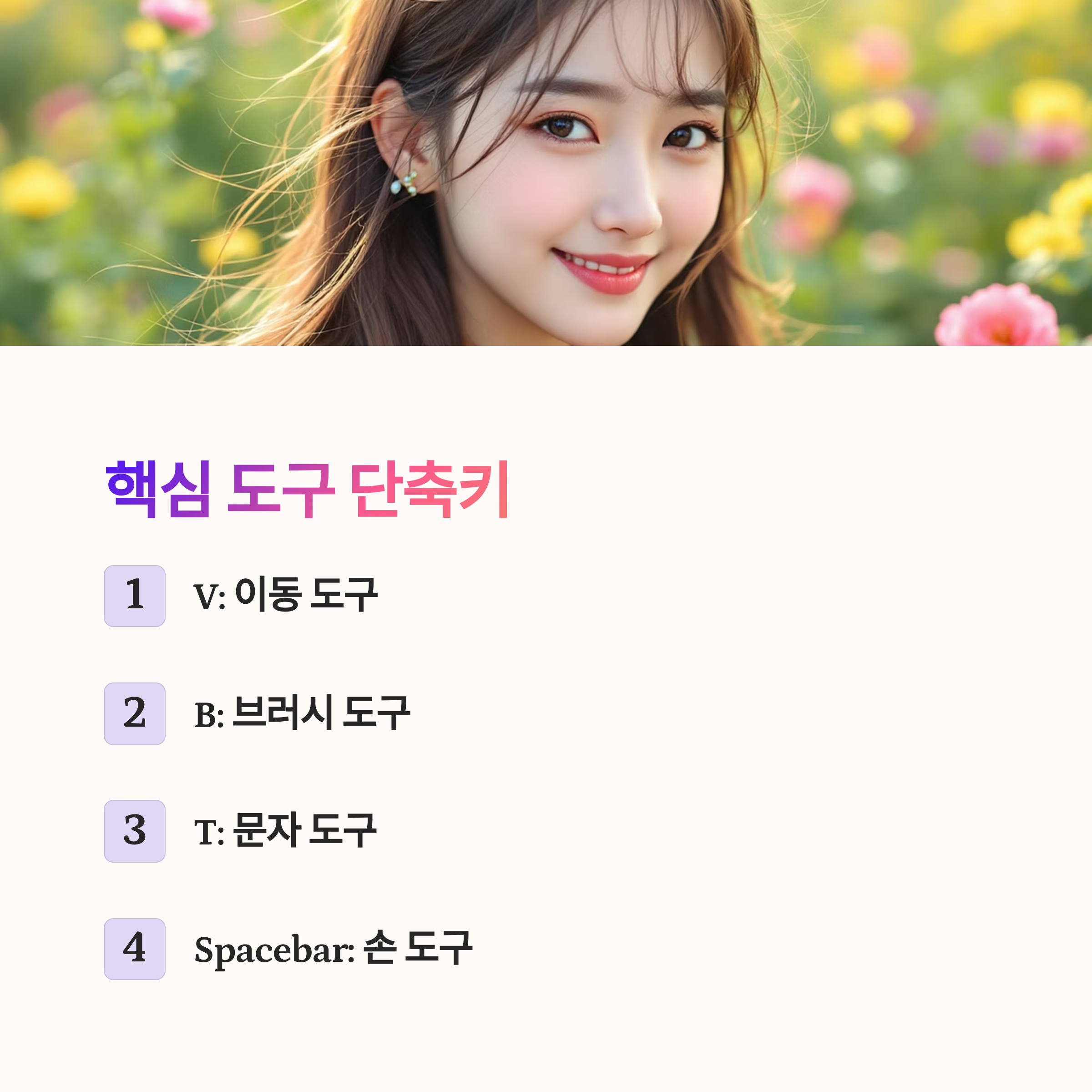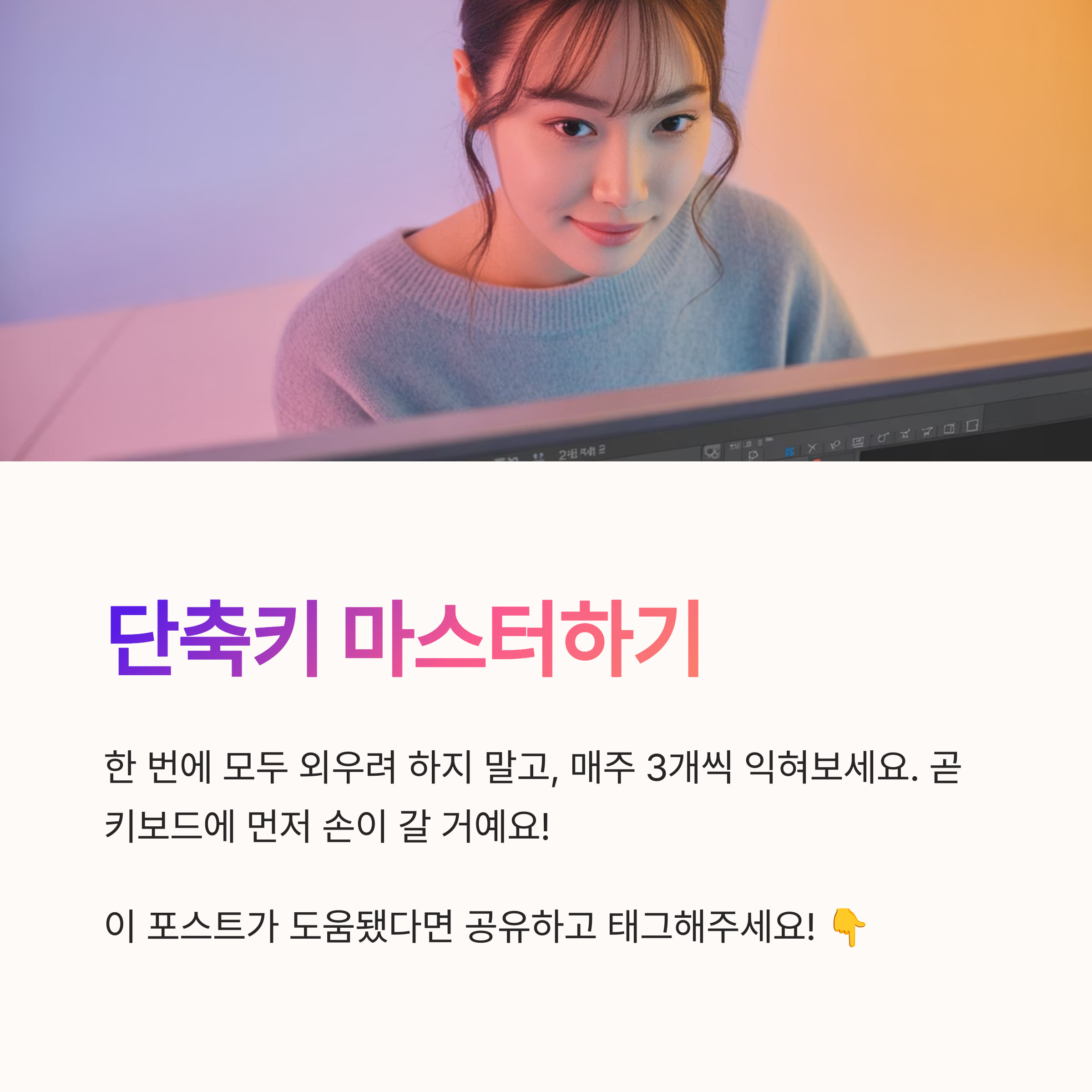 단축키를 외우는 것은 공부가 아니라 습관입니다. 오늘 소개해 드린 방대한 포토샵 단축키 모음을 한 번에 다 외우려고 하지 마세요. 대신, 이번 주에는 레이어 관련 단축키 3개, 다음 주에는 브러시 관련 단축키 3개처럼 자신만의 목표를 정하고 꾸준히 사용해 보세요.
