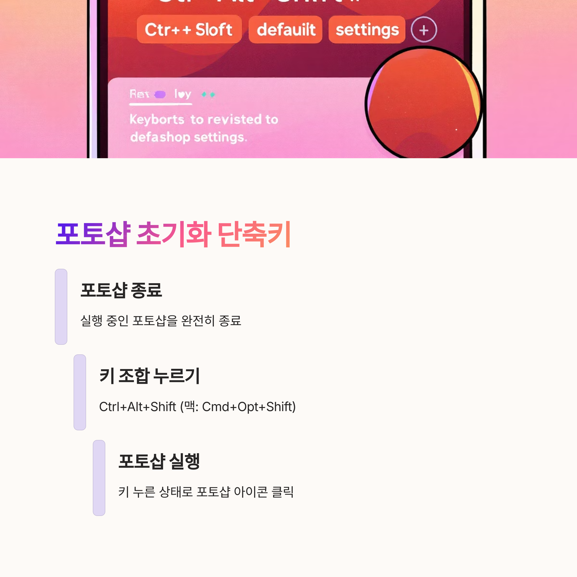 이럴 때 프로그램을 껐다 켜도 해결되지 않는다면 포토샵 초기화 하는 단축키를 사용해 보세요. 마치 컴퓨터를 포맷하듯, 포토샵 설정을 공장 출고 상태로 되돌려 대부분의 문제를 해결할 수 있습니다.