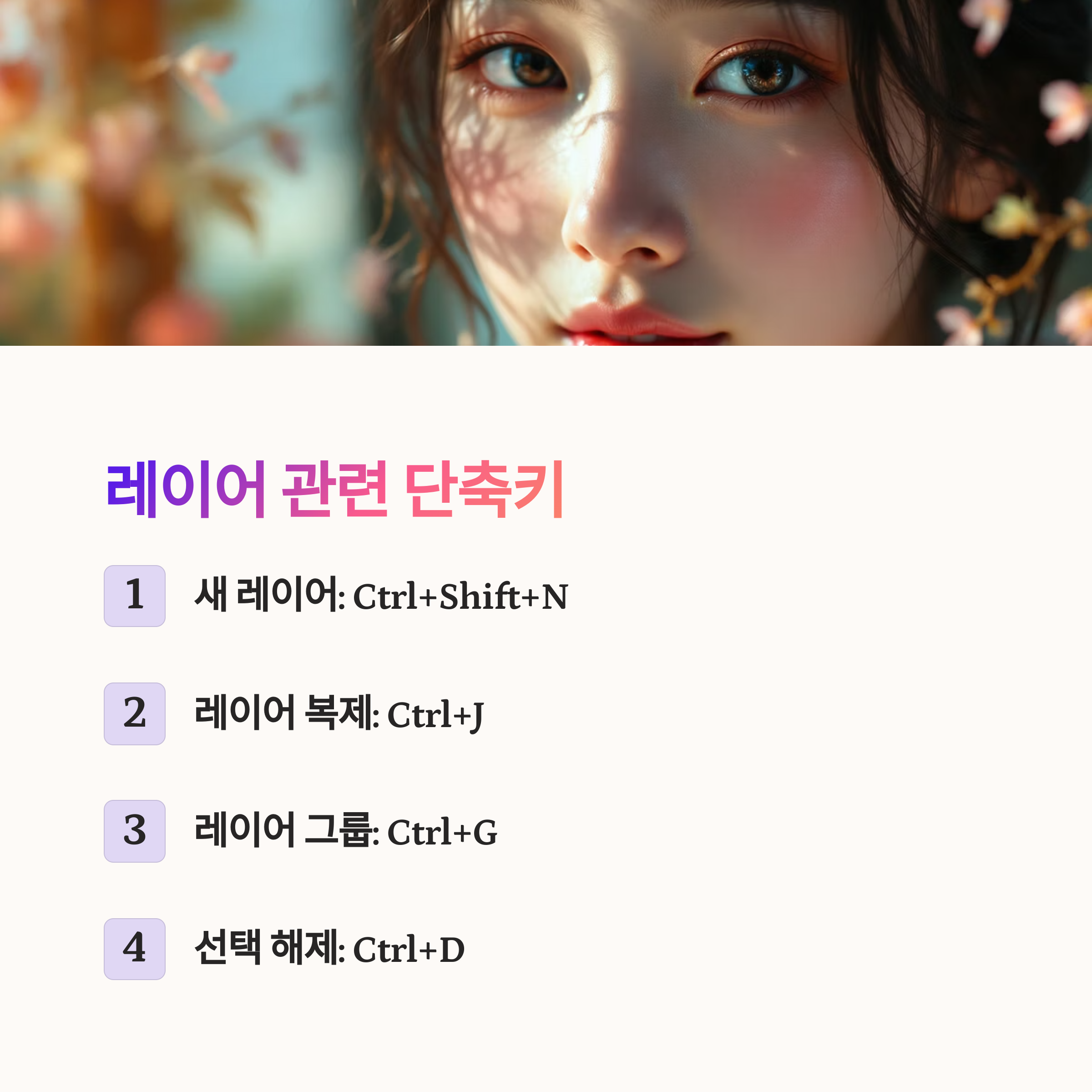 포토샵은 레이어와의 싸움이라고 해도 과언이 아닙니다. 수많은 레이어를 효율적으로 관리하는 단축키를 익히면 작업의 질이 달라집니다. 이 포토샵 단축키 모음 섹션은 꼭 마스터해 보세요.