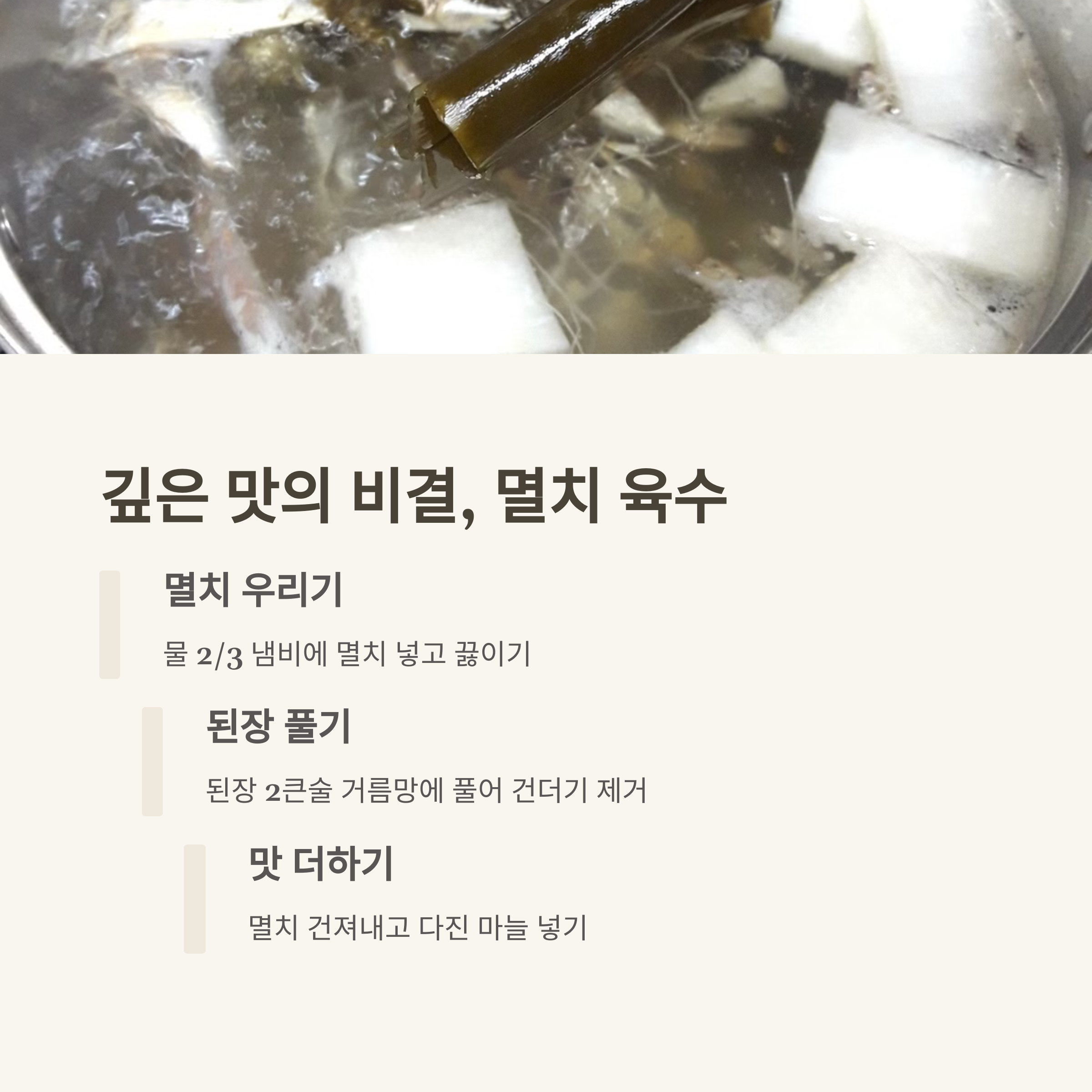 2. 육수 강화: 멸치 외에 표고버섯 2개(건조 10g)나 바지락 100g을 추가하면 시원함이 배가돼요.