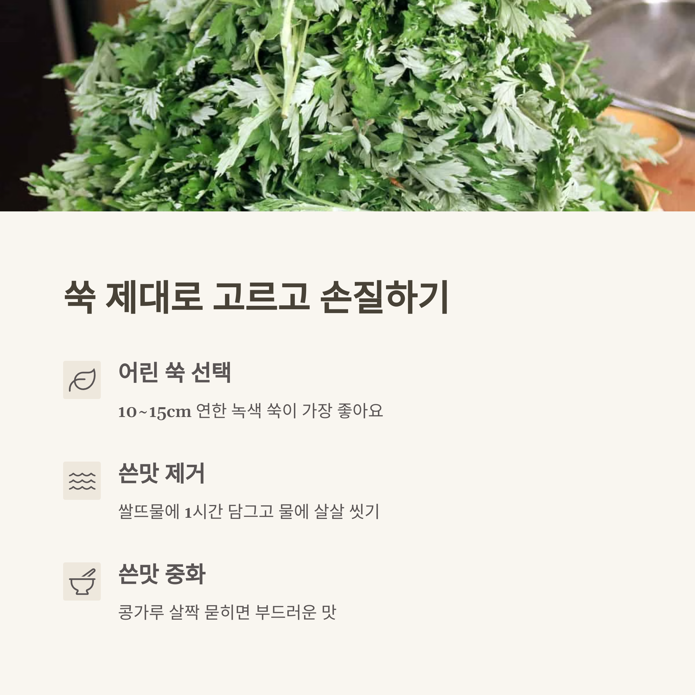 - 쑥 데치기: 쓴맛이 강할 땐 끓는 물에 쑥을 2~3분 데친 뒤 찬물에 헹궈요.