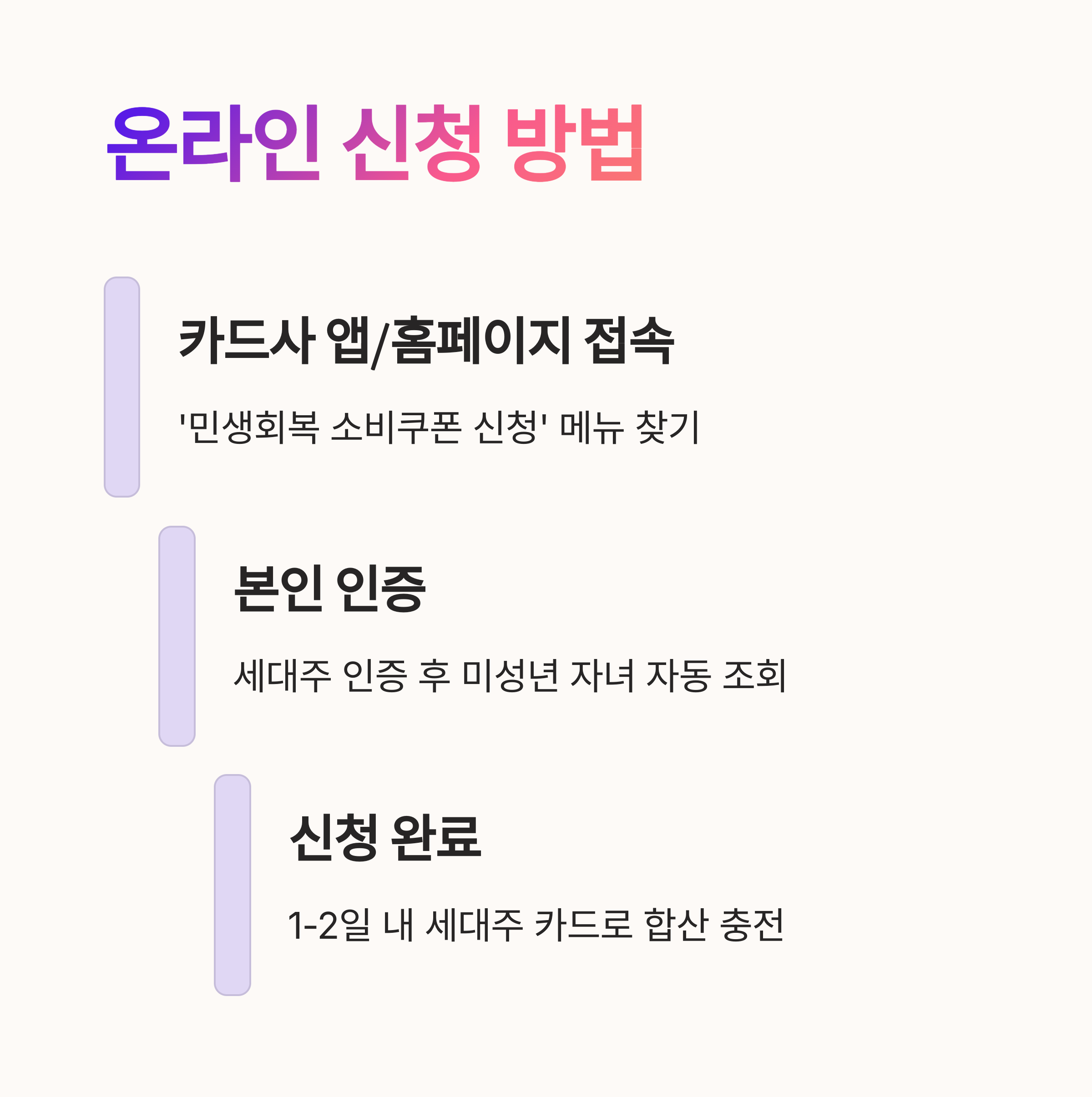 세대주 본인 명의의 신용/체크카드를 발급한 카드사 앱이나 홈페이지에 접속하여 '민생회복 소비쿠폰 신청' 메뉴를 찾아주세요. 또는 거주하는 지역의 지역사랑상품권 앱을 통해서도 신청이 가능합니다.