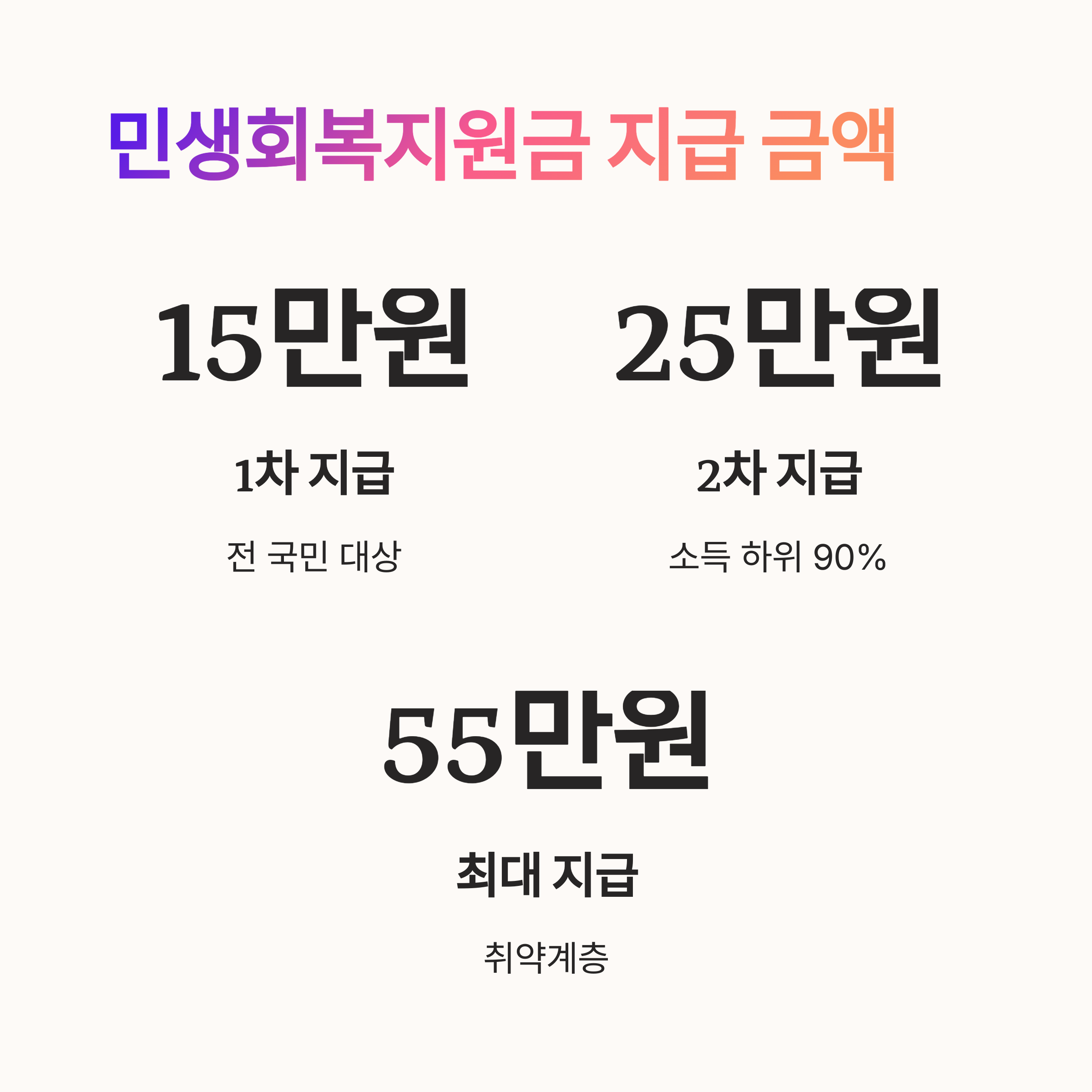 민생회복지원금은 이재명 정부의 2025년 추가경정예산(추경)으로 추진되는 정책으로, 전 국민에게 1차로 15만 원, 소득 하위 90%에게 2차로 추가 10만 원, 취약계층(기초생활수급자, 차상위계층 등)에게는 최대 55만 원까지 지급됩니다.