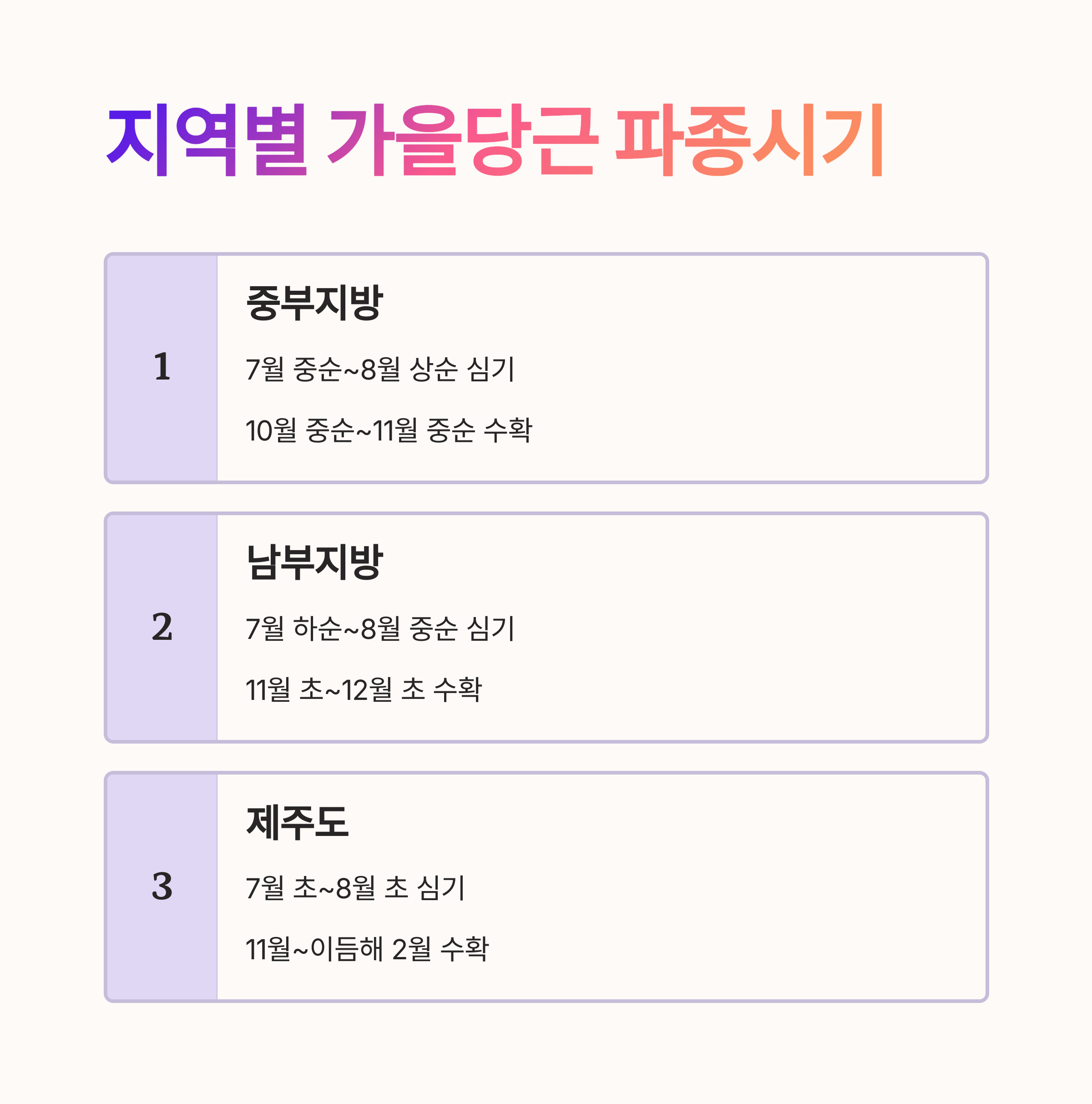 장마가 끝난 7월 말~8월 초에 파종하면 고온 피해를 줄이고 발아율을 높일 수 있어요. 남부지방은 중부지방보다 1~2주 늦게 심는 게 좋아요.