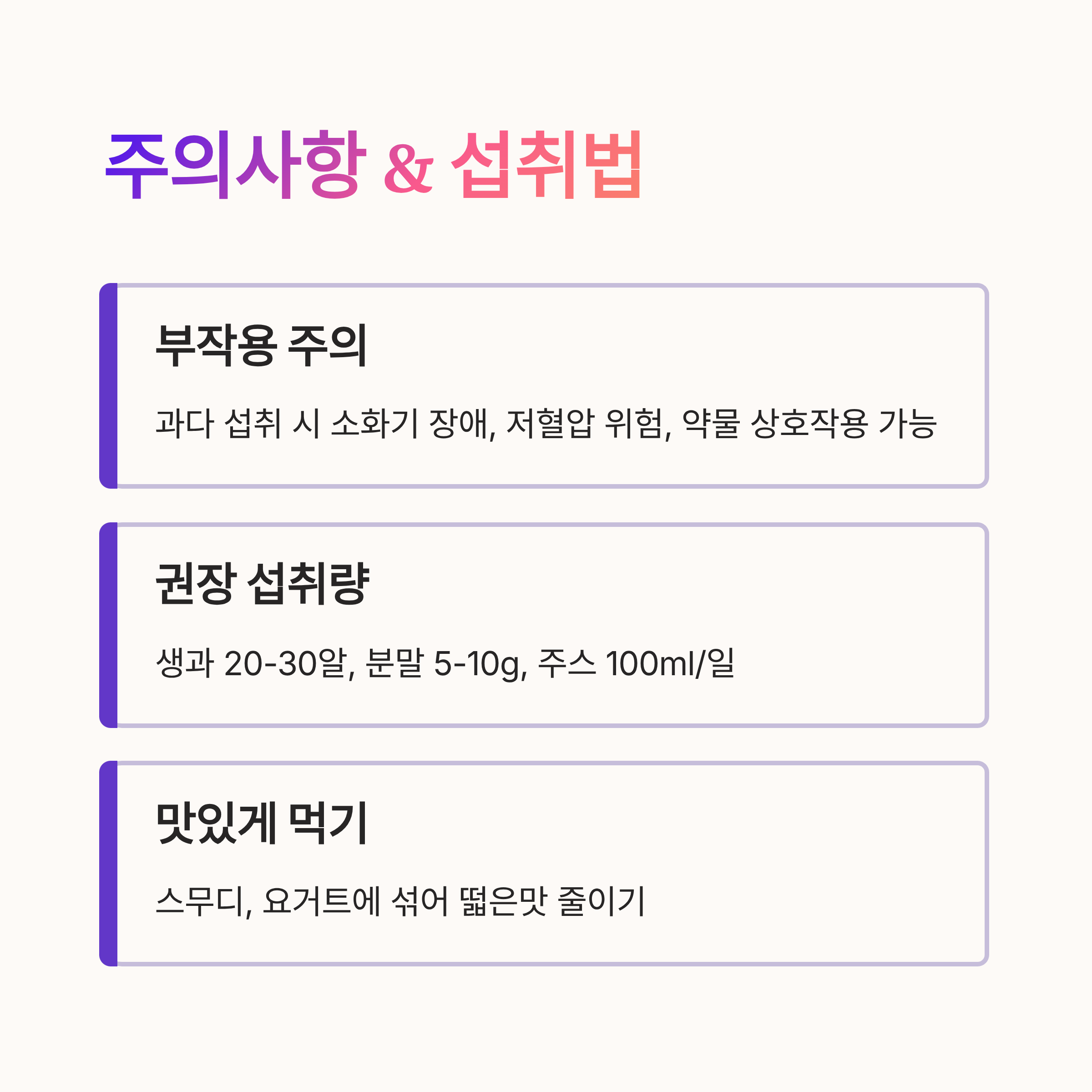 드물게 피부 발진이나 가려움증 같은 알레르기 반응이 나타날 수 있어요. 처음 섭취 시 소량으로 시작해 몸의 반응을 확인하세요.