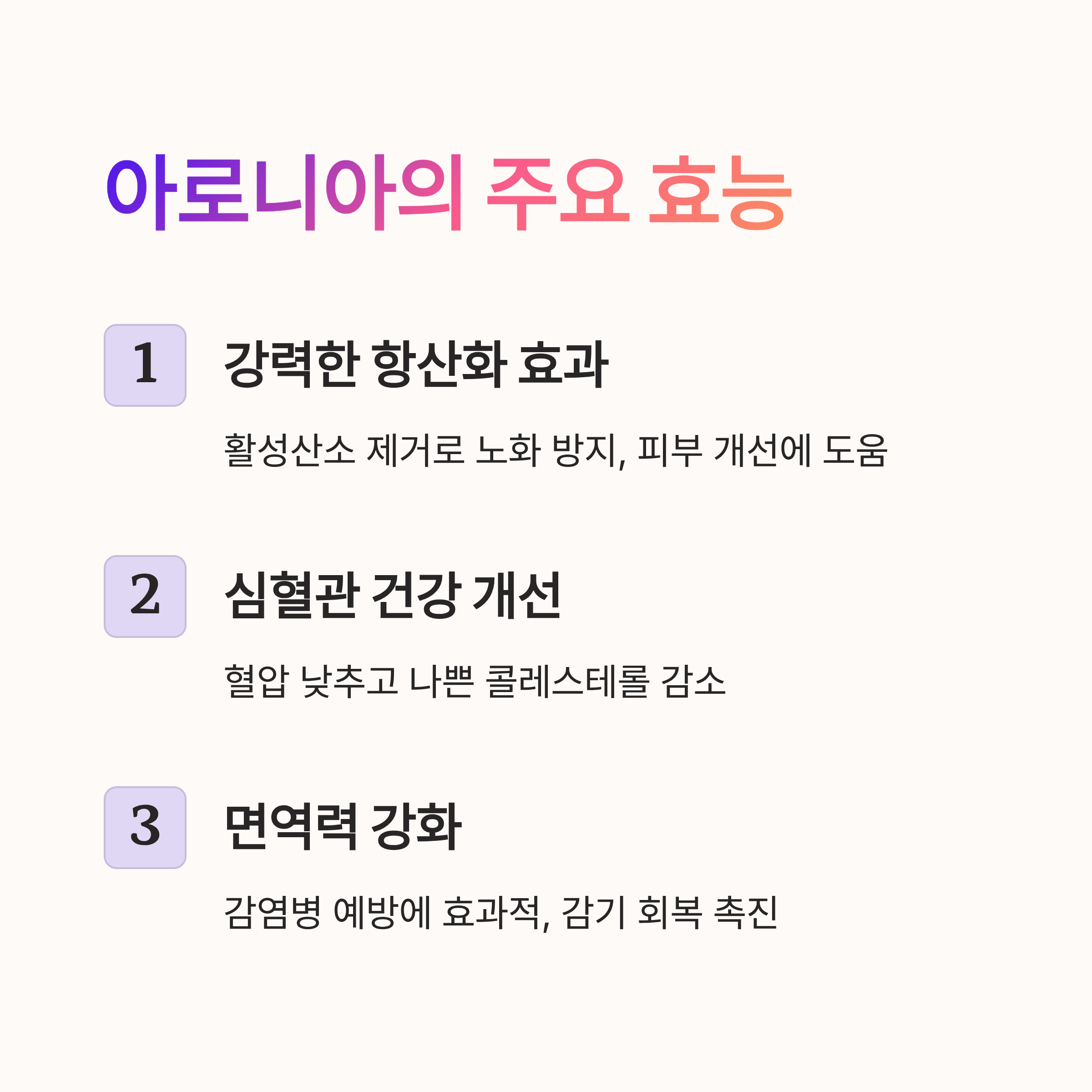 아로니아 효능은 과학적 연구를 통해 입증되었으며, 일상에서 꾸준히 섭취하면 건강에 큰 도움을 줍니다. 아래는 대표적인 7가지 효능입니다.