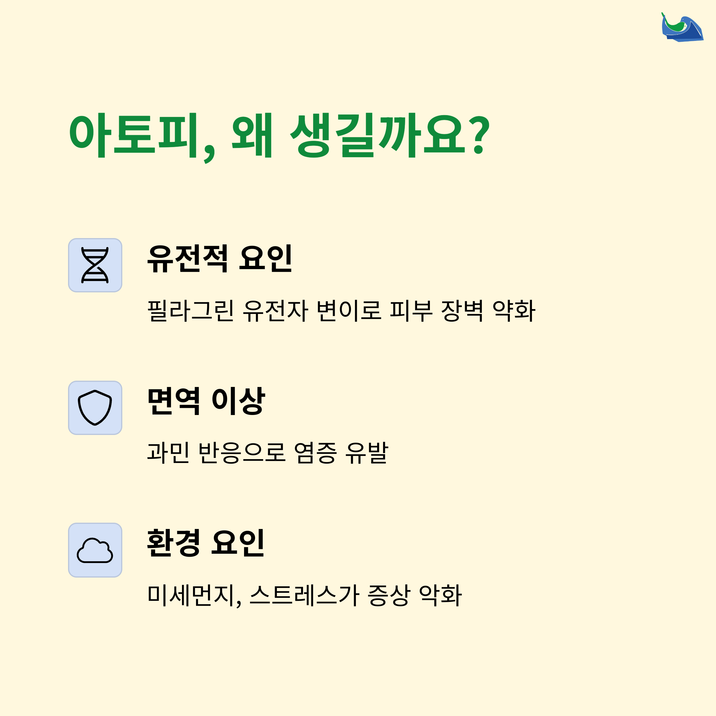 유전적인 소인, 면역 체계 이상, 피부 장벽 손상이 주요 원인으로 꼽히죠. 특히 피부 장벽 단백질인 ‘필라그린’ 유전자 변이가 중요한 역할을 한다는 연구가 2006년에 발표된 이후 주목받고 있습니다.