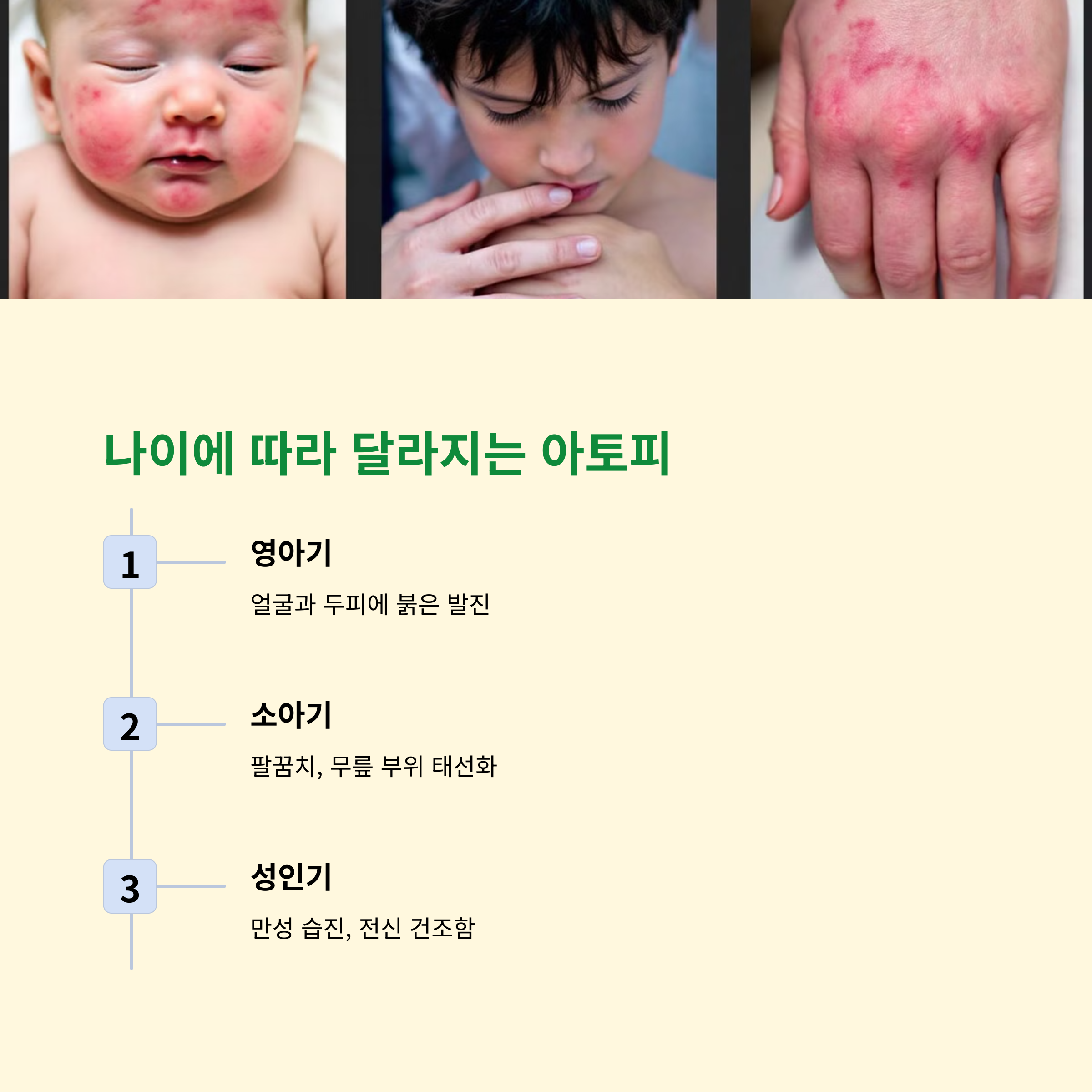 | 소아 (2~12세) | 건조, 태선화, 가려움 | 팔꿈치 안쪽, 무릎 뒤 |