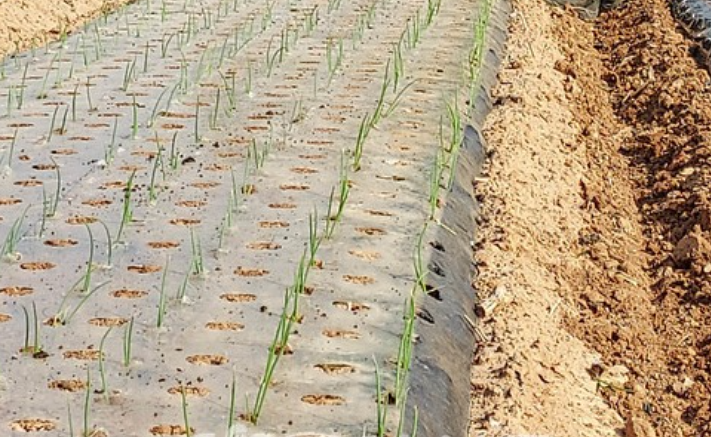 그 다음 잡초 방지와 지온 유지, 수분 증발을 막기 위해 검은색 유공 비닐로 멀칭을 해줍니다. 이렇게 하면 겨우내 양파가 얼어 죽는 것을 막고 봄철 가뭄도 어느 정도 예방할 수 있습니다.