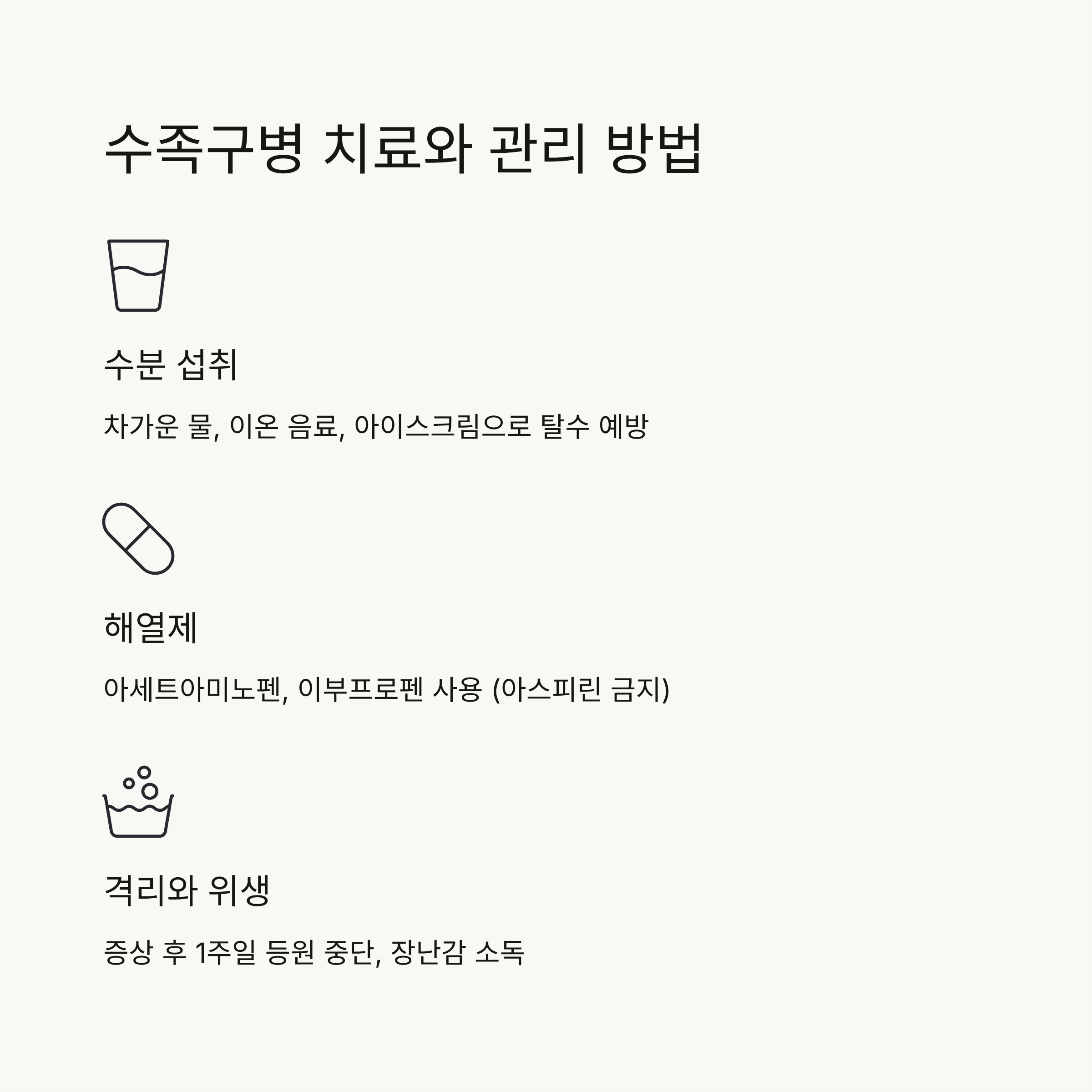 수족구병은 특별한 항바이러스 치료제가 없어 증상을 완화하는 대증요법이 주로 사용됩니다. 아이가 편안히 회복할 수 있도록 몇 가지 관리 방법을 알려드릴게요. 💡