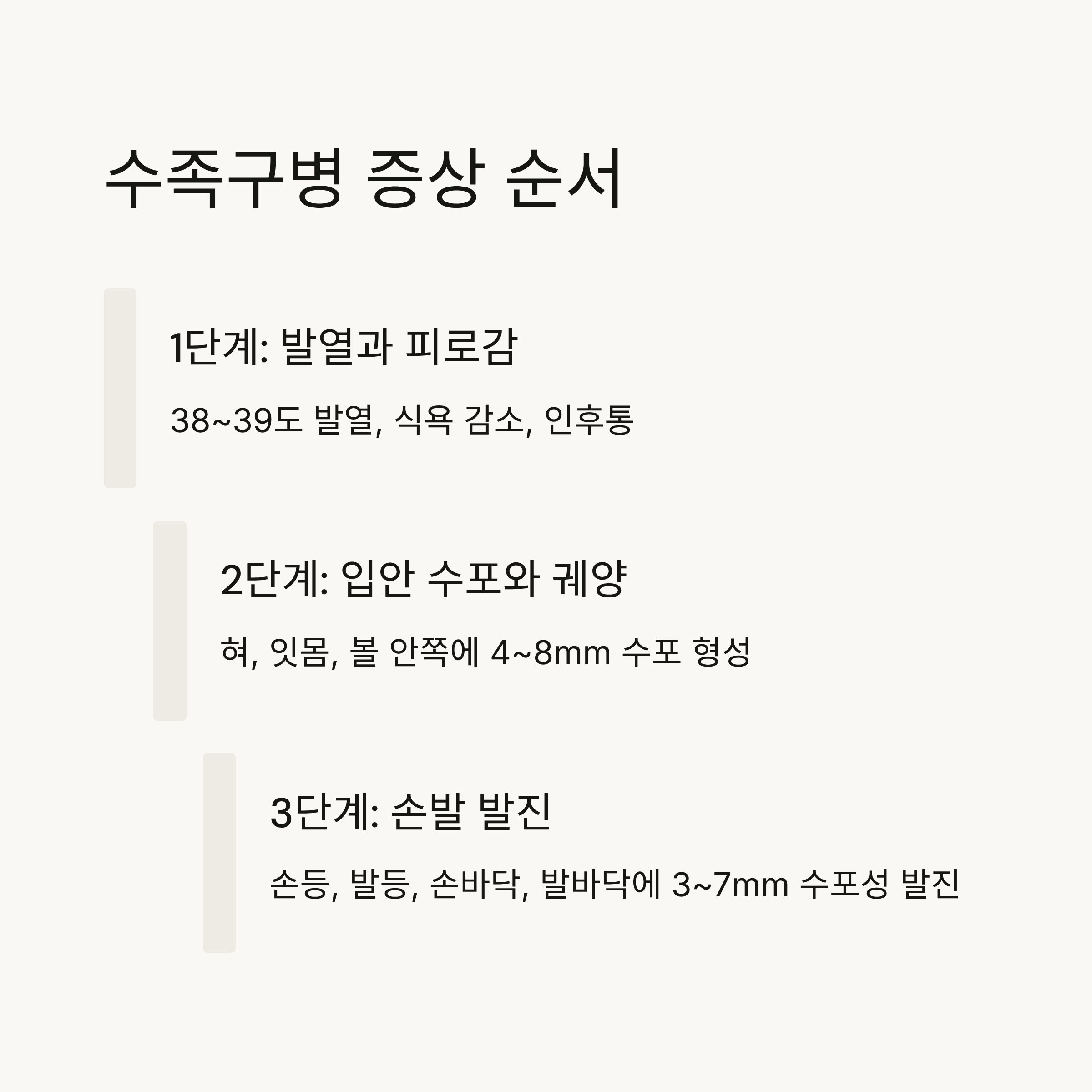 수족구병 증상 순서는 대체로 일정한 패턴을 따라 나타납니다. 아이마다 증상의 강도나 순서가 조금 다를 수 있지만, 일반적인 흐름을 알아두면 빠르게 대처할 수 있어요. 📌