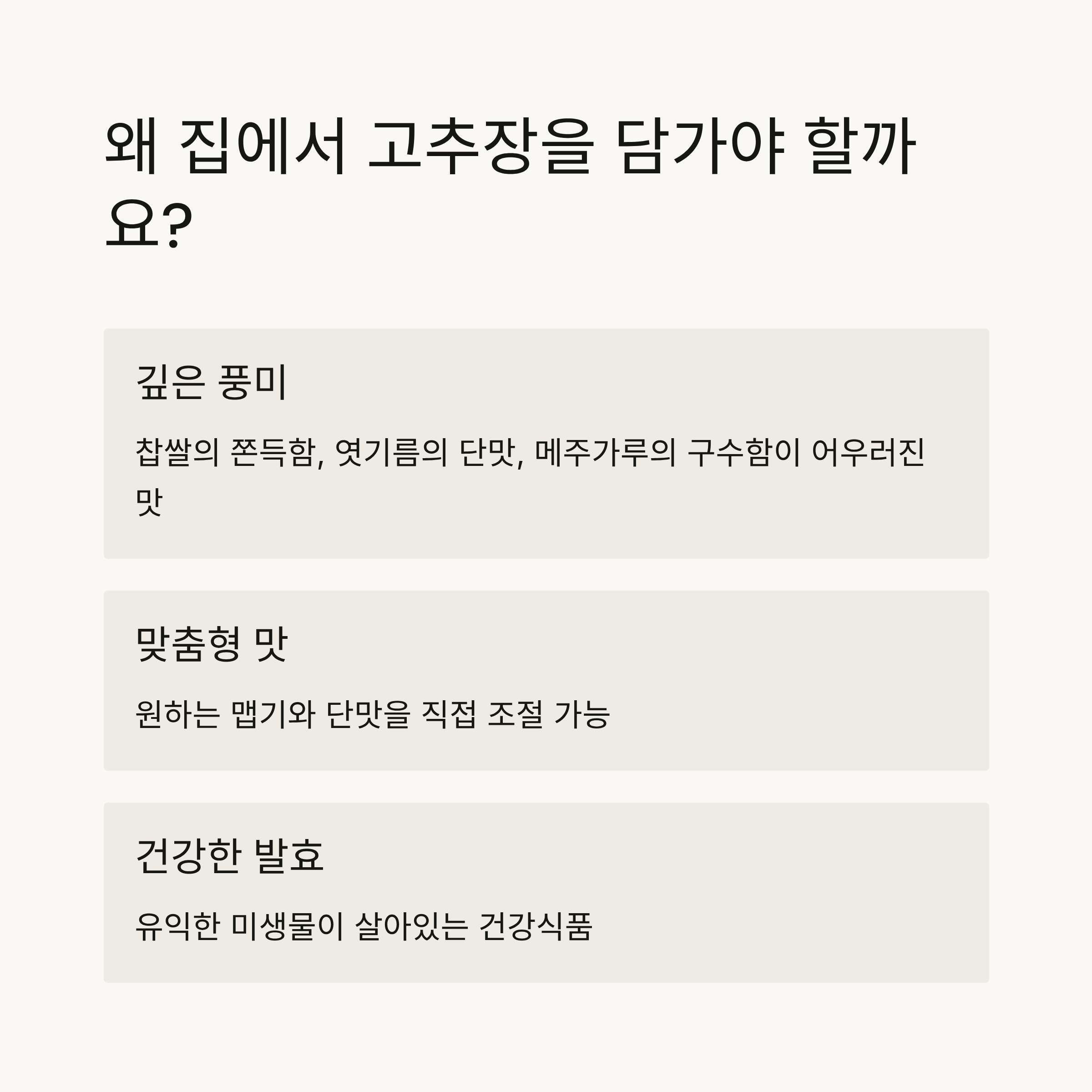 찹쌀의 쫀득한 질감과 엿기름의 깊은 단맛, 메주가루의 구수함이 어우러져 찌개, 비빔밥, 무침 등 어떤 요리에도 깊은 맛을 더해줍니다. 게다가 직접 만들면 원하는 맵기와 단맛을 조절할 수 있어 입맛에 딱 맞는 고추장을 얻을 수 있죠.