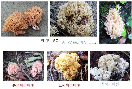 | 싸리버섯 | 버섯은 옅은 황백색, 가지 끝은 담홍색・ 담자색 | 가지 끝 색깔이 싸리버섯은 담홍색을 띰 | 버섯은 유황색, 가지끝은 황색 | 노랑싸리버섯 |