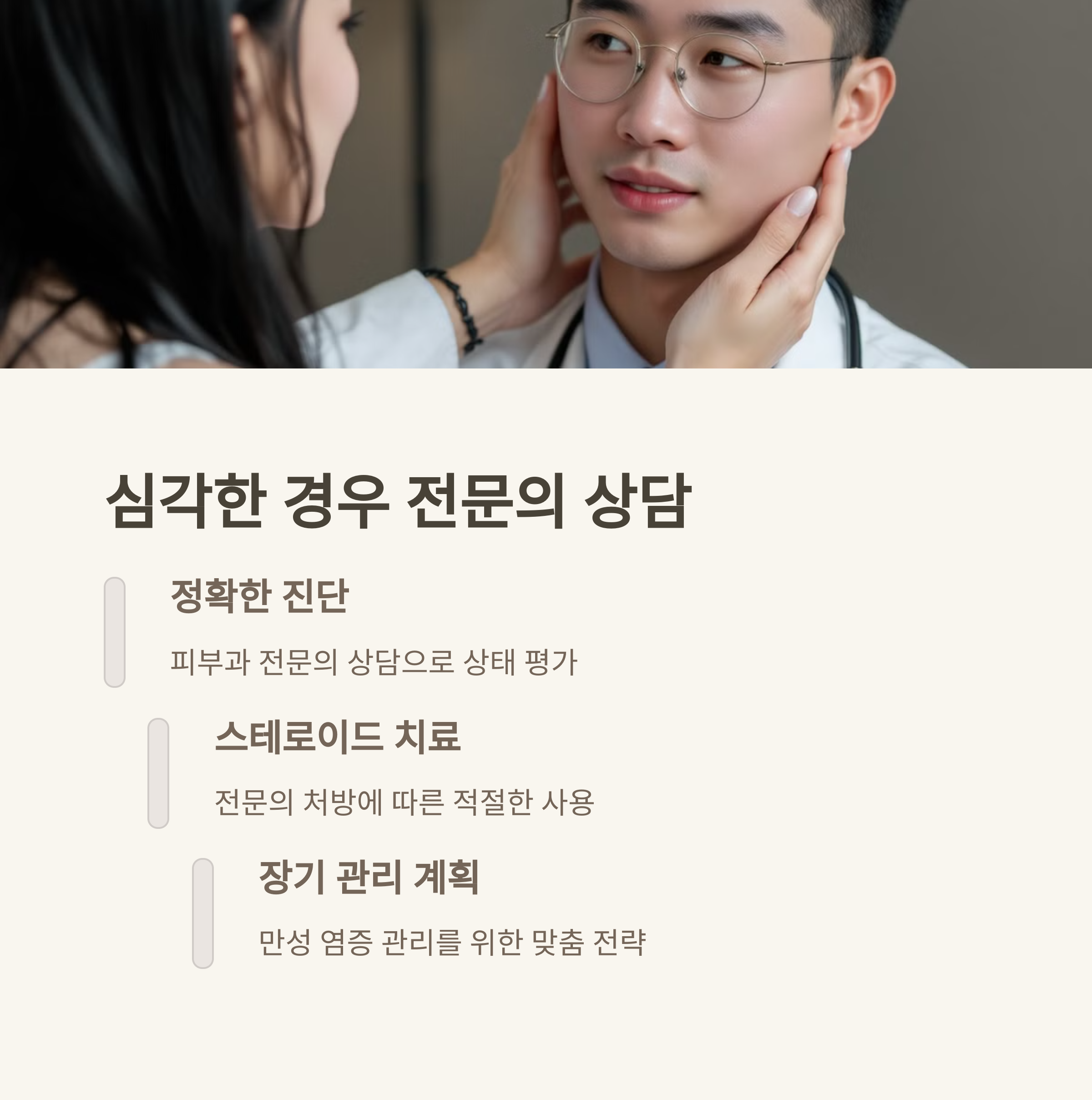 피부과를 방문해 국소 스테로이드제나 타크로리무스를 처방받아보세요. 단기 사용으로 염증을 조절할 수 있어요.