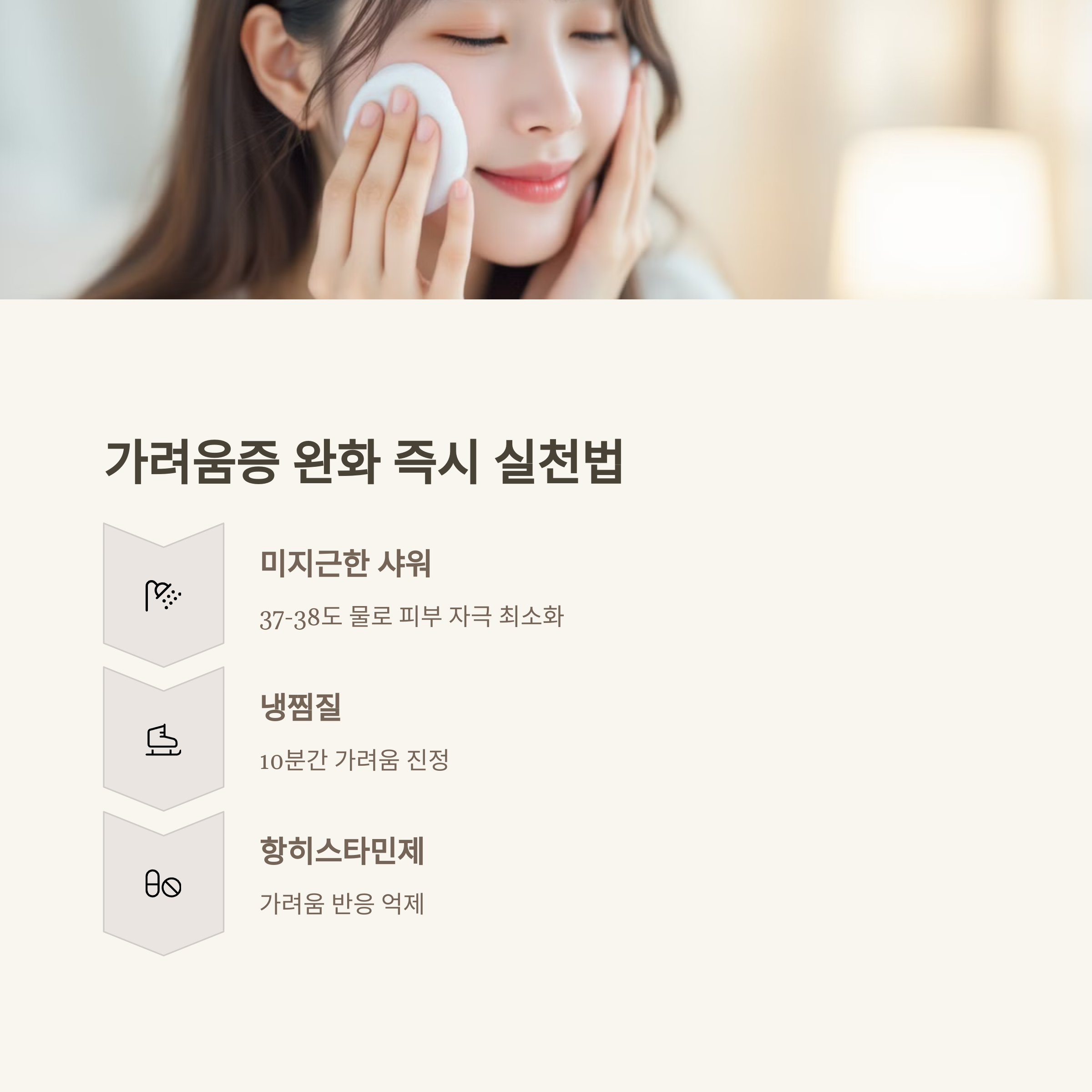 - 냉찜질로 진정: 깨끗한 수건에 얼음물을 적셔 가려운 부위에 10분간 올리면 즉각적인 완화 효과가 있습니다.