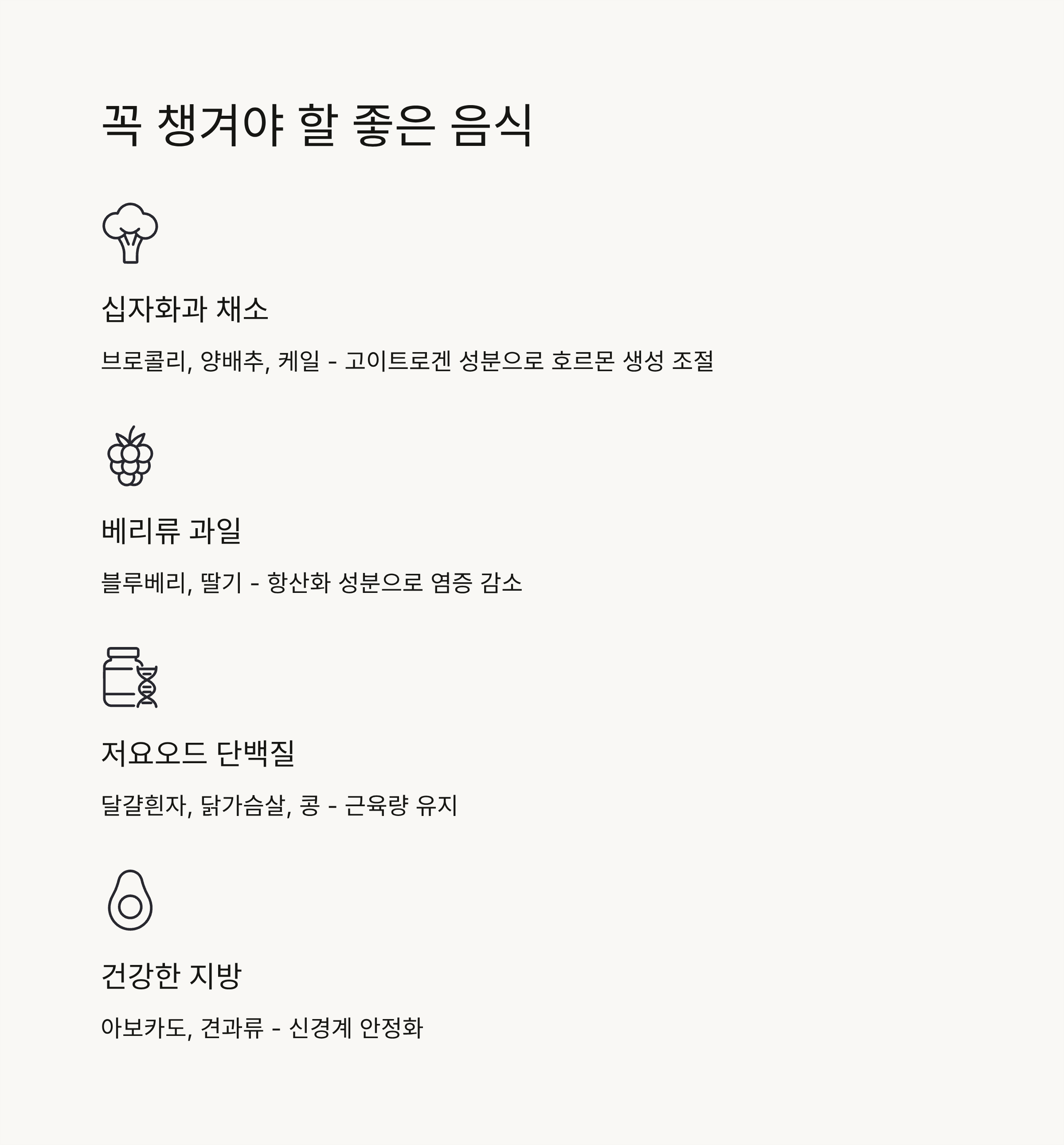 하지만 요오드 함량이 높은 해산물이나 유제품은 피하는 것이 좋으므로, 달걀흰자, 닭가슴살, 두부나 콩류와 같은 저요오드 고단백 식품으로 보충해 주는 것이 현명합니다. 근육량을 유지하고 체력을 보충하는 데 큰 도움이 될 거예요.