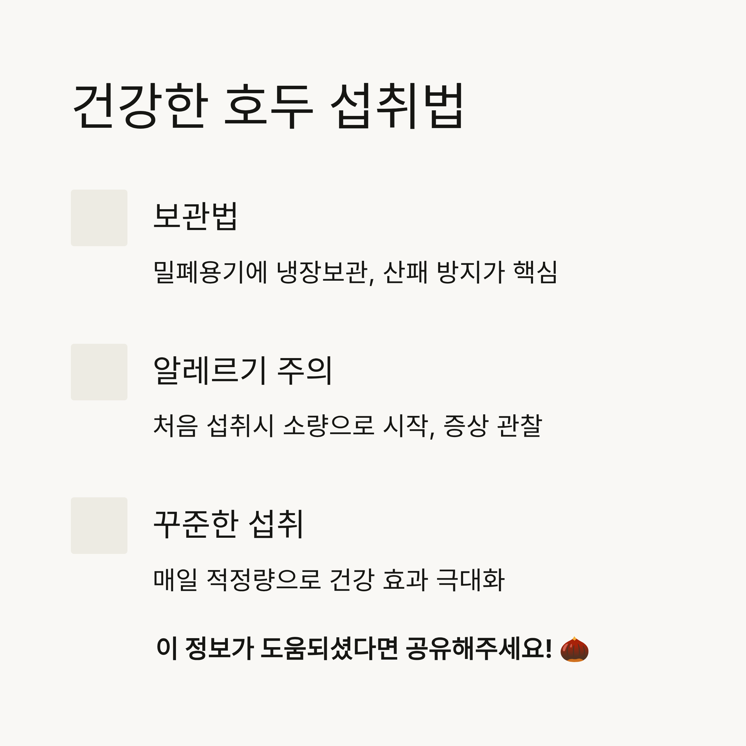 오늘부터라도 하루 한 줌, 건강 간식으로 호두를 챙겨 드셔보는 건 어떨까요? 작은 습관 하나가 당신의 건강을 더욱 단단하게 지켜줄 것입니다. 올바른 호두 하루 섭취량을 기억하시고 건강한 하루 보내시길 바랍니다.