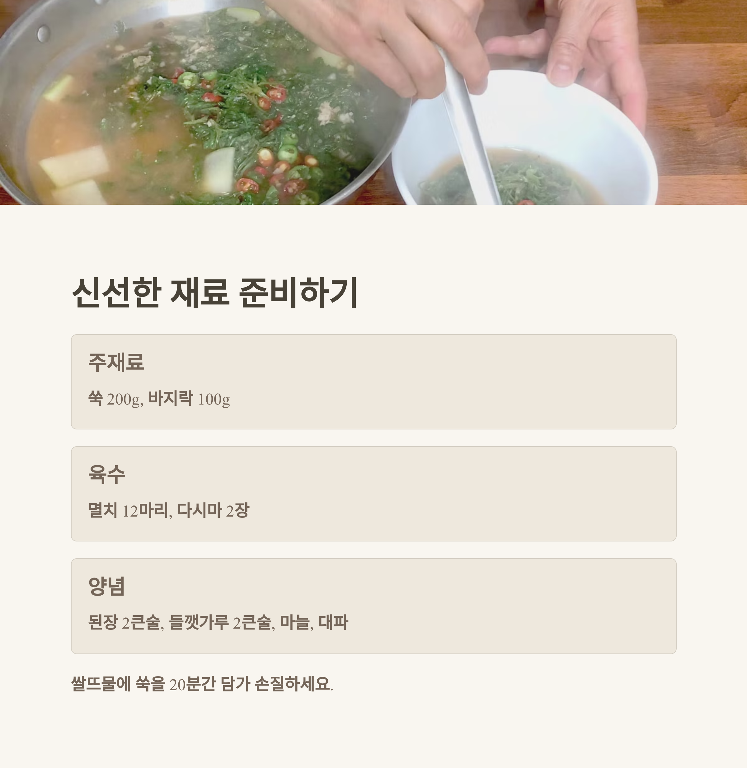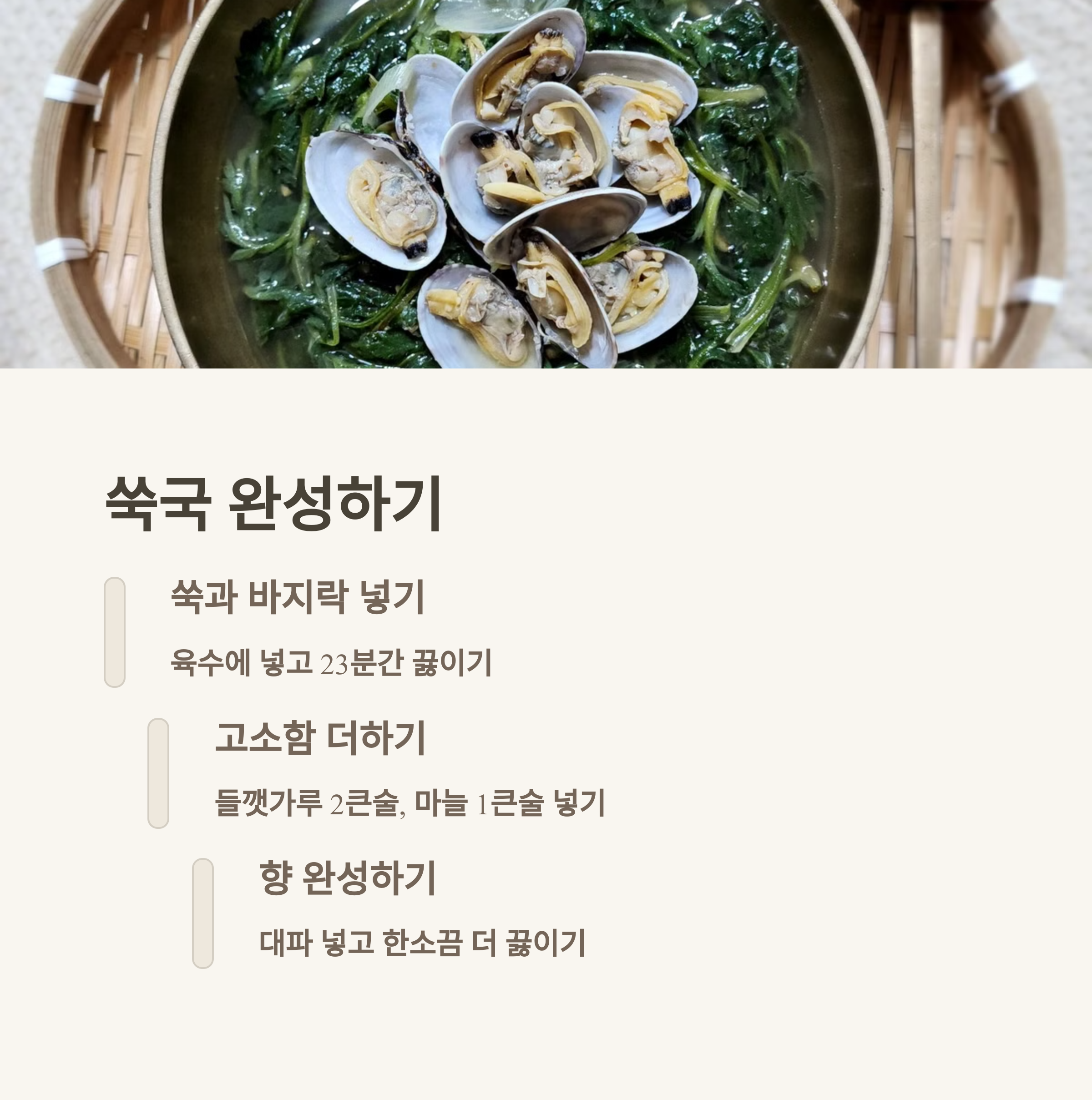 이제 쑥국 맛있게 끓이는 법의 핵심 과정을 상세히 알려드릴게요: