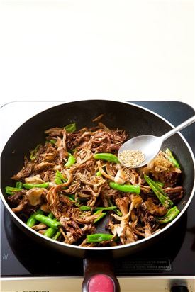 6. 마지막으로 불을 끄고 들깻가루와 후추, 통깨를 넣어 버무리면 고소한 향이 가득한 싸리버섯 볶음 완성입니다!