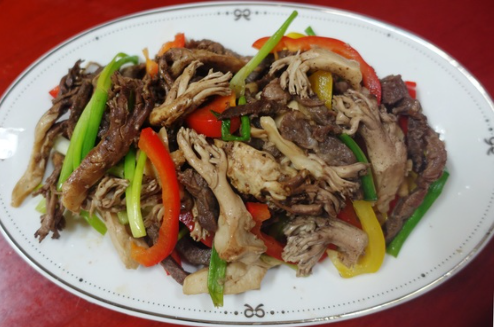 5. 버섯에 간이 배면 대파, 홍고추를 넣고 가볍게 섞어줍니다.